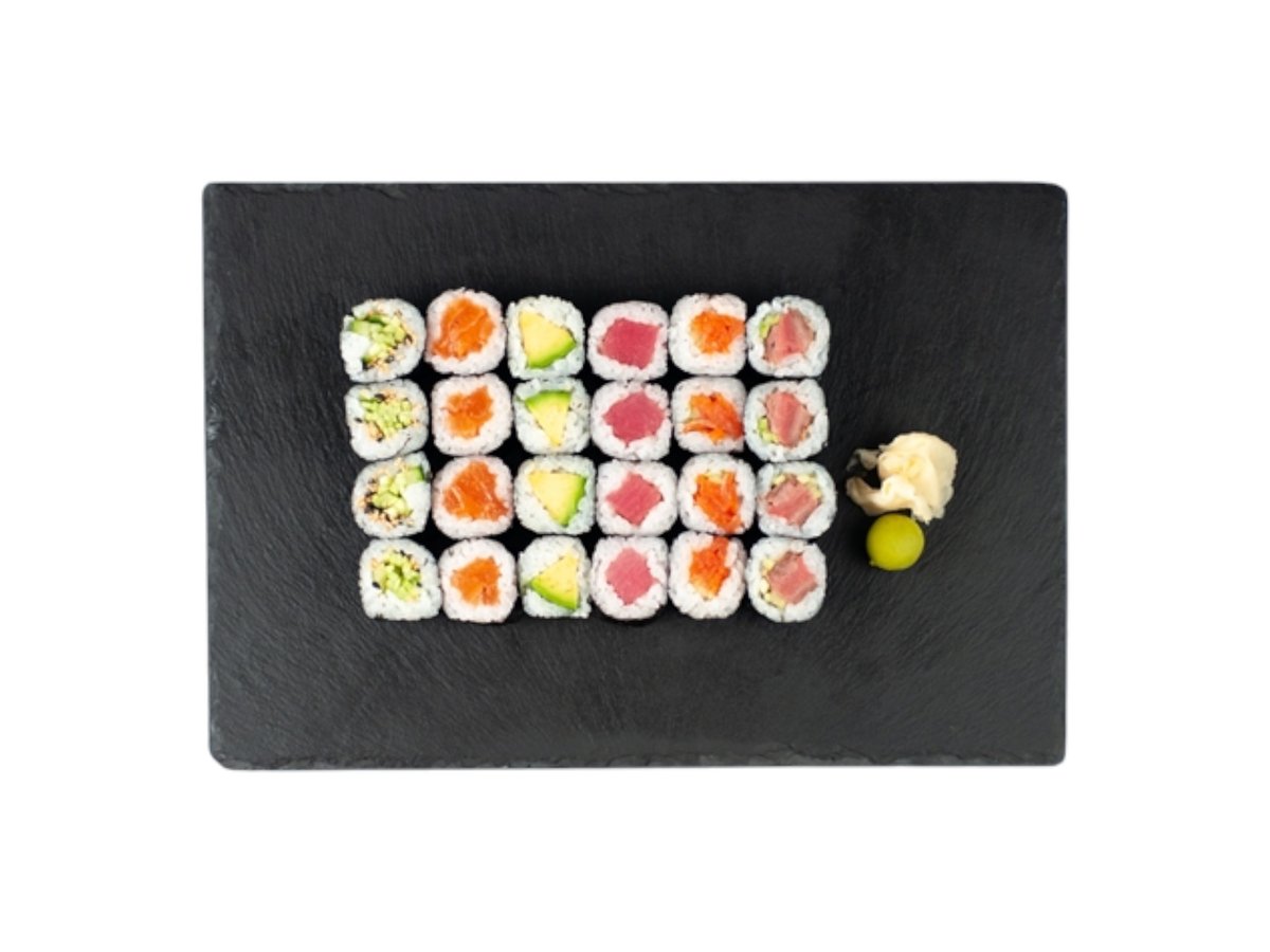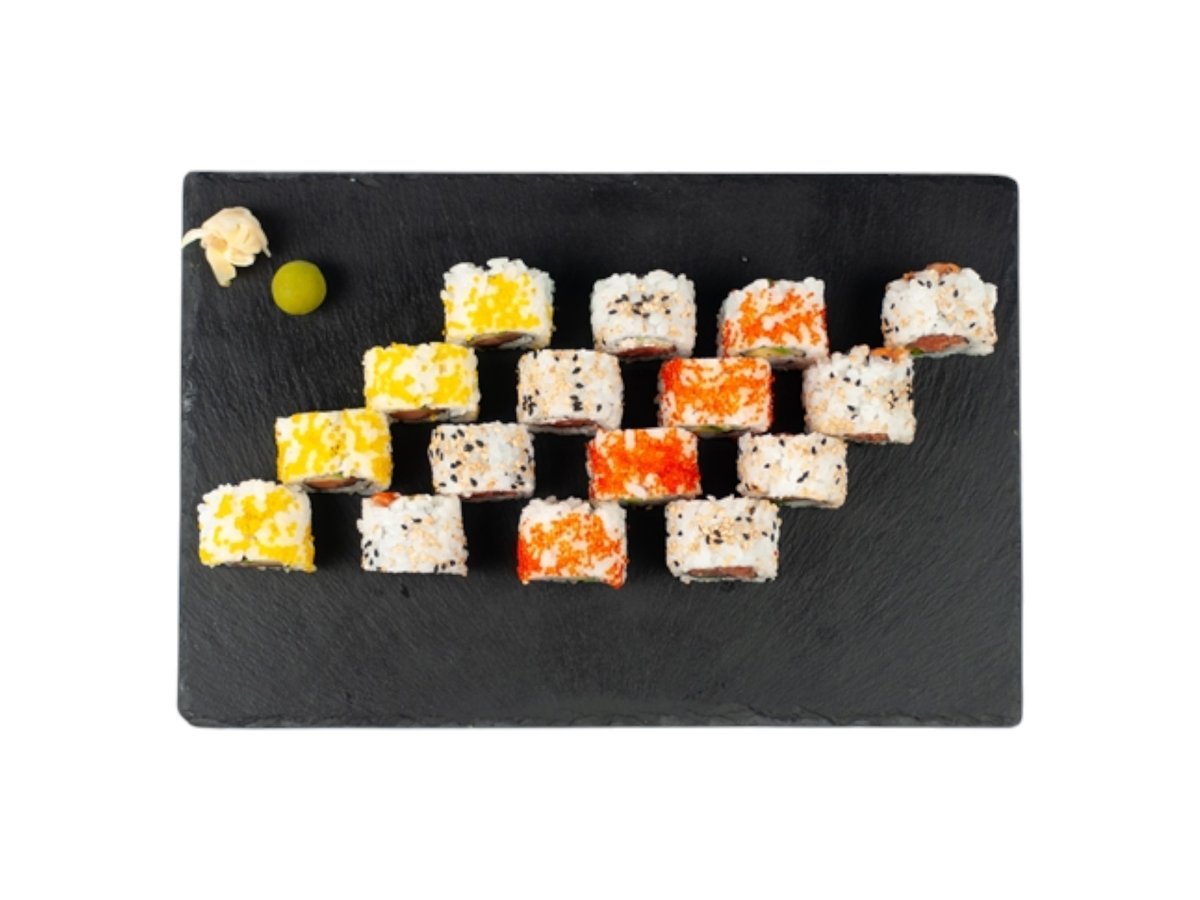 хосомаки краставица 4х, хосомаки авокадо 4х, хосомаки сьомга 4х, хосомаки тон 4х, хосомаки пушена сьомга 4х, хосомаки телешко 4х, урамаки пикантен тон 4х, урамаки сьомга и авокадо, 4х урамаки Филаделфия, 4х урамаки Калифорния 4х, напитка по избор