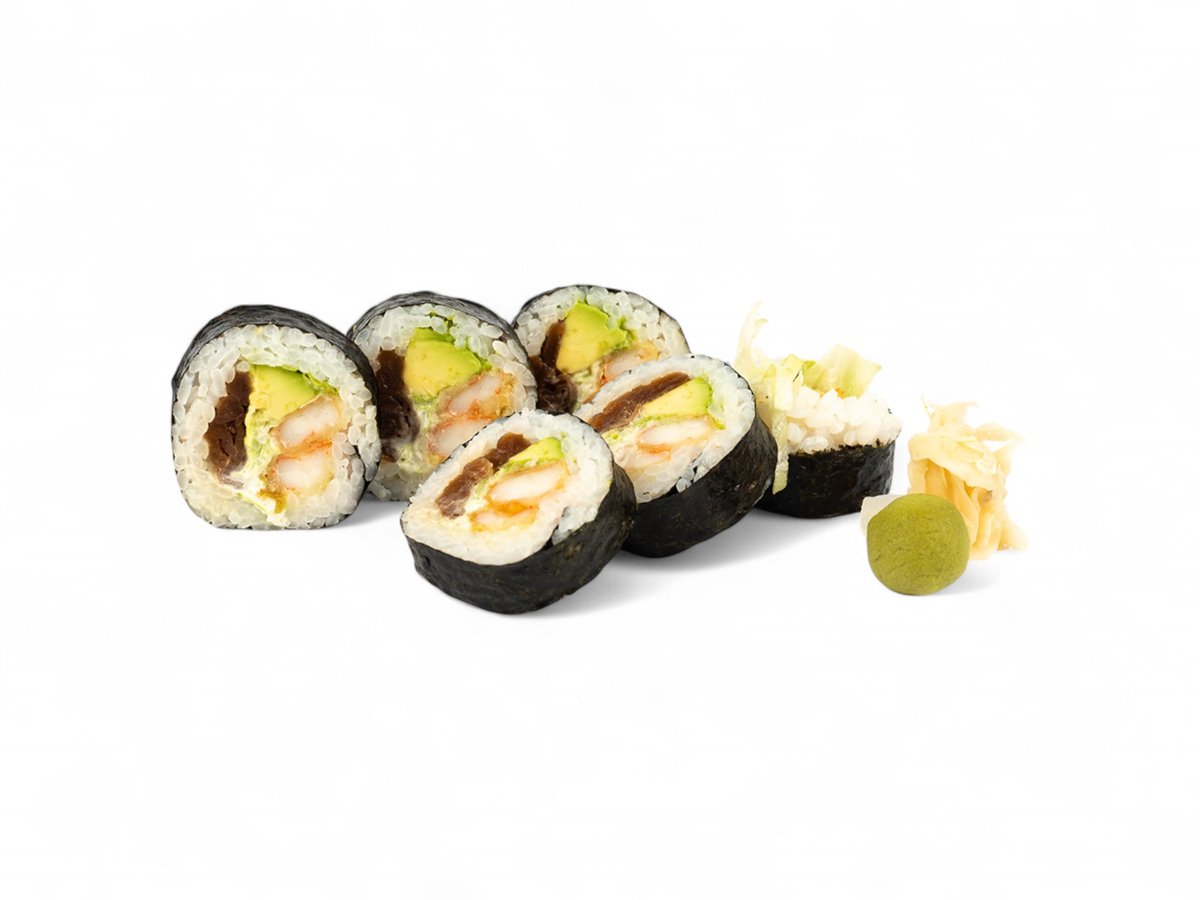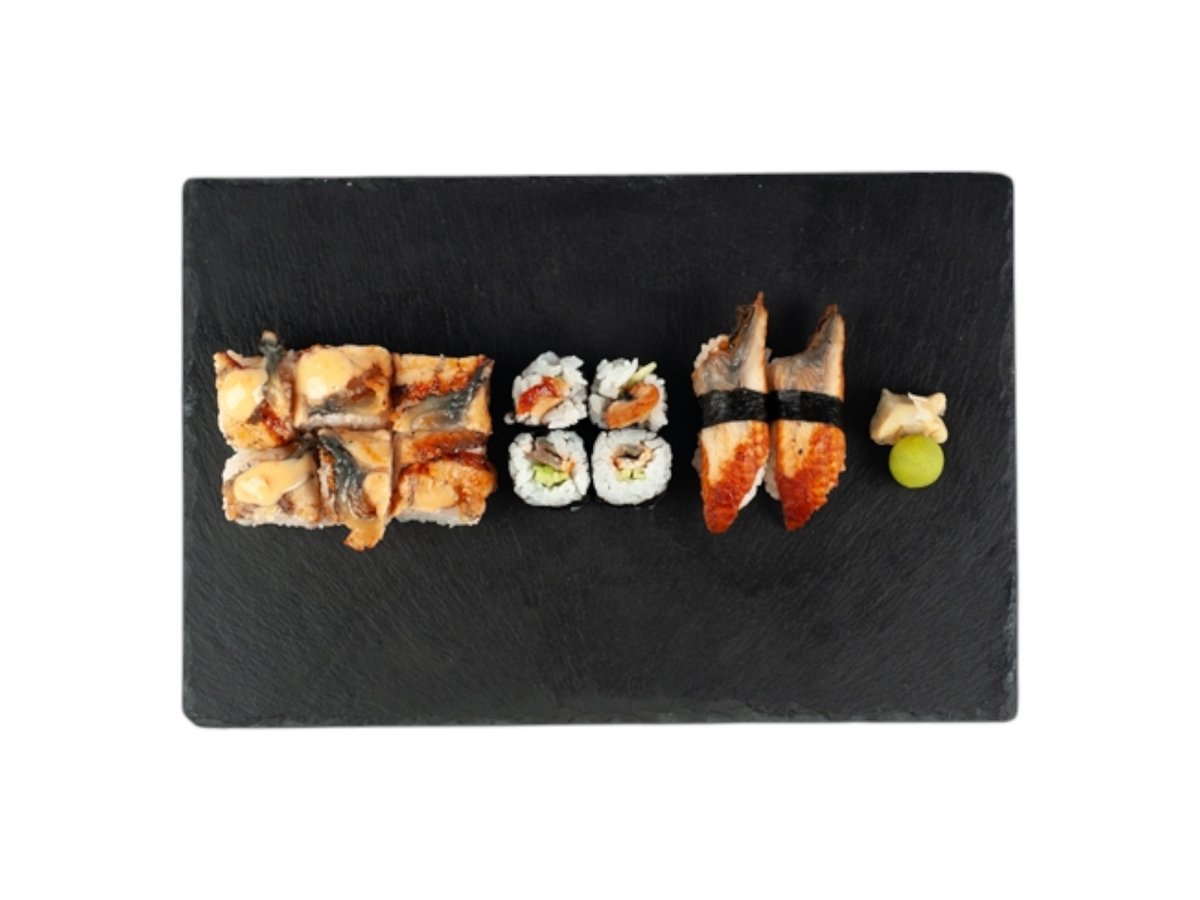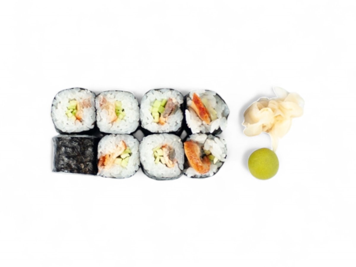 8 броя, ориз, нори, краставица, авокадо, маринована змиорка, унаги сос, към всяка порция има джинджифил, уасаби и соев сос 200г