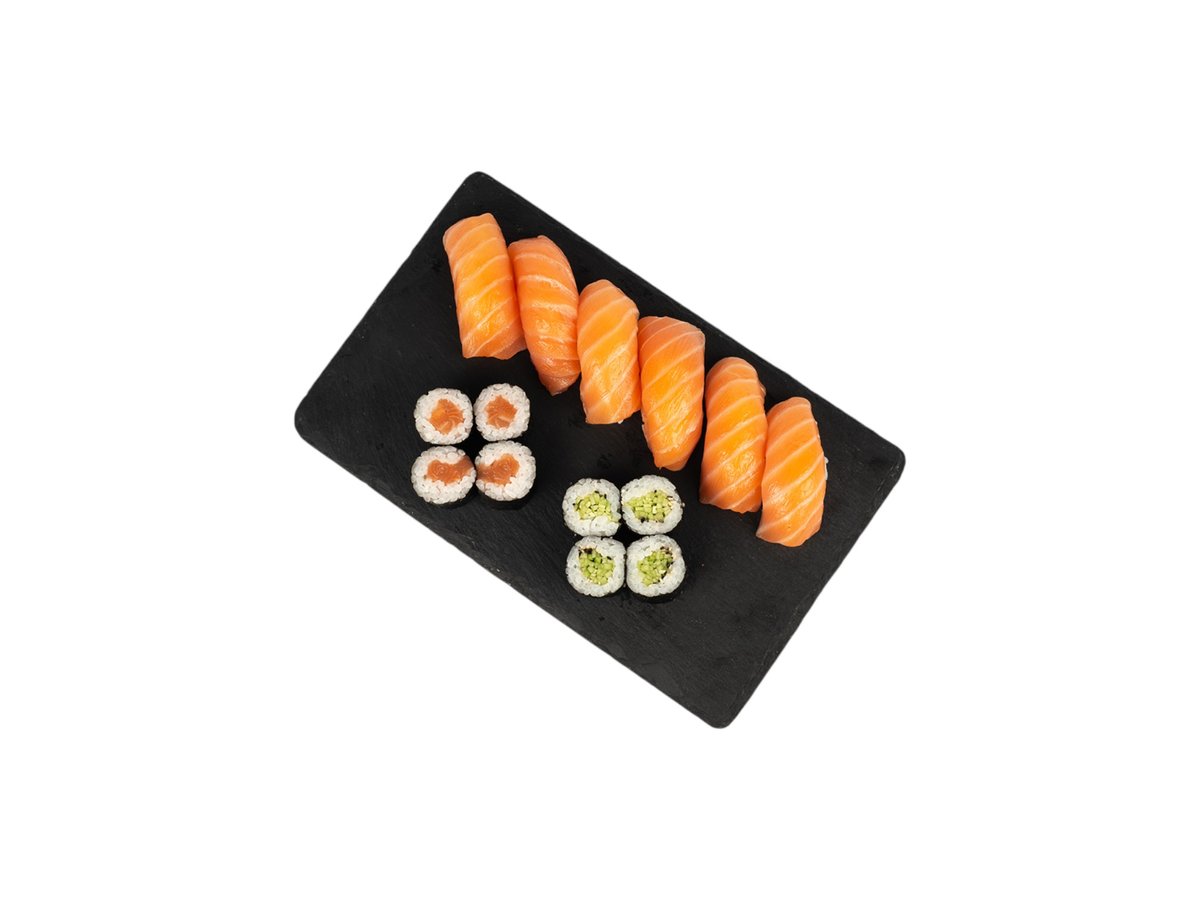16 броя, нигири сьомга 2х, хосомаки сьомга 8х, футомаки сьомга и авокадо 6х, татаки сьомга 30г (комплекта включва: 1 брой клечки за суши, 1х 20г джинджифил, 1х 20г уасаби, 1x 20мл соев сос Kikkoman Less Salt) 360г