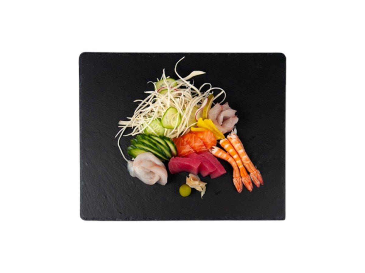 30 броя, сашими: сьомга 40г, тон 40г, лаврак 40г, скарида Еби 3х, нигири лаврак 2х, нигири скариди 2х, нигири сьомга 2х, хосомаки сьомга 4х, хосомаки тон 4х, урамаки тон и краставица 4х (2 клечки, 40г джинджифил, 40г уасаби, 40мл соев сос) 820г