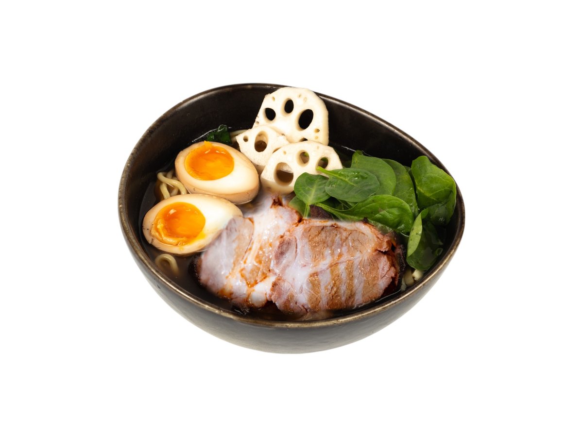 домашен рамен бульон, пресни нудли, мариновани свински гърди (чашу), мариновани гъби шийтаке, мариновано яйце, хрупкав лотос, пресен спанак, маринован бамбук, пресен лук 600г