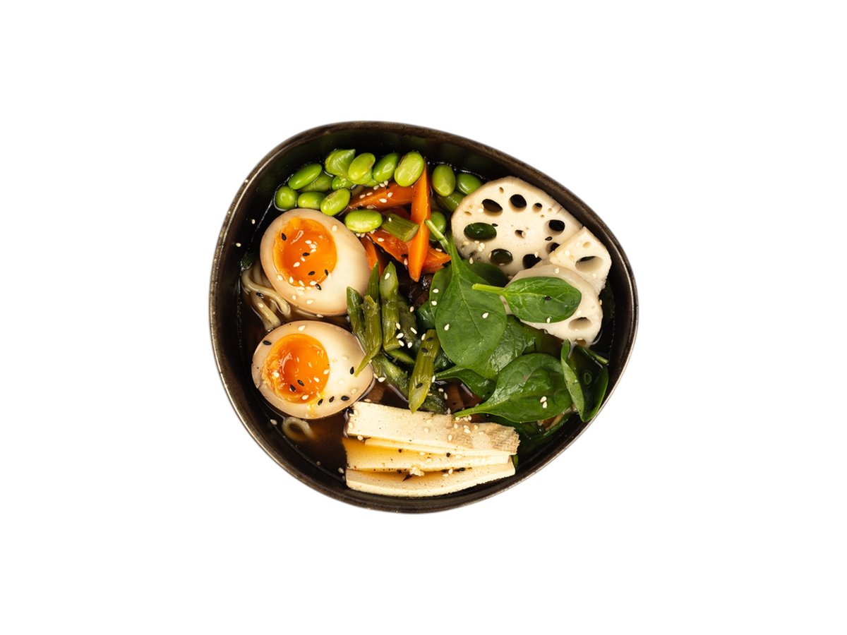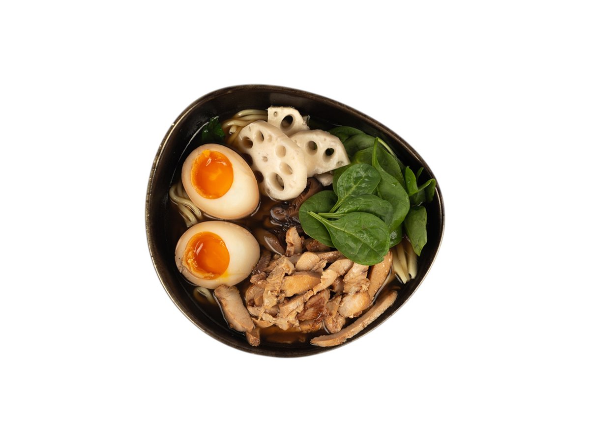 домашен рамен бульон, пресни нудли, гъби шийтаке, мариновано яйце, хрупкав лотос, пресен спанак, мариновано пилешко филе, пресен лук 500г
