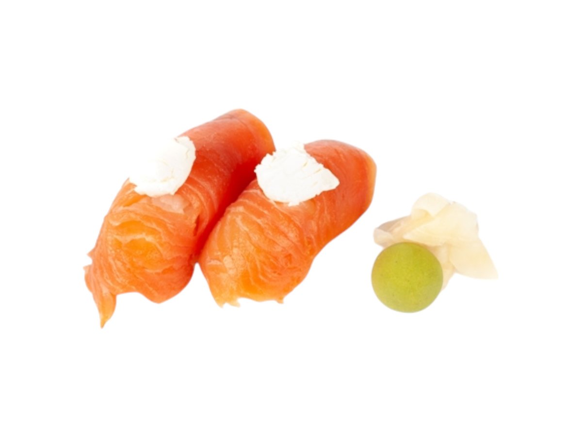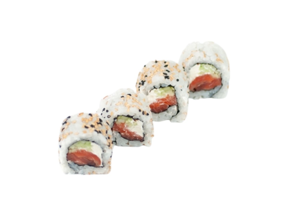 4 броя, ориз, нори, краставица, Филаделфия, пушена сьомга, сусам, към всяка порция има джинджифил, уасаби и соев сос 110г