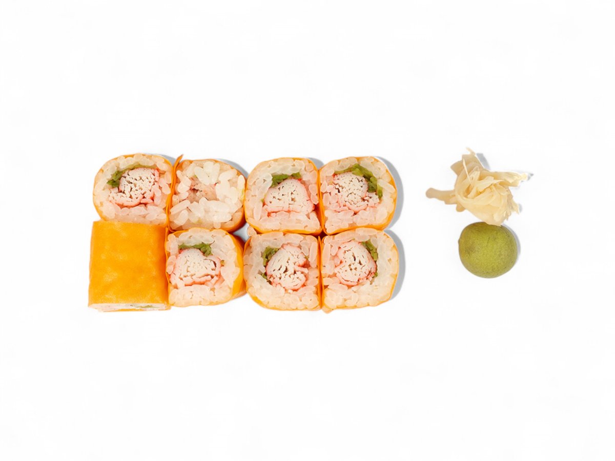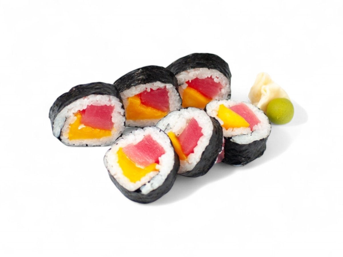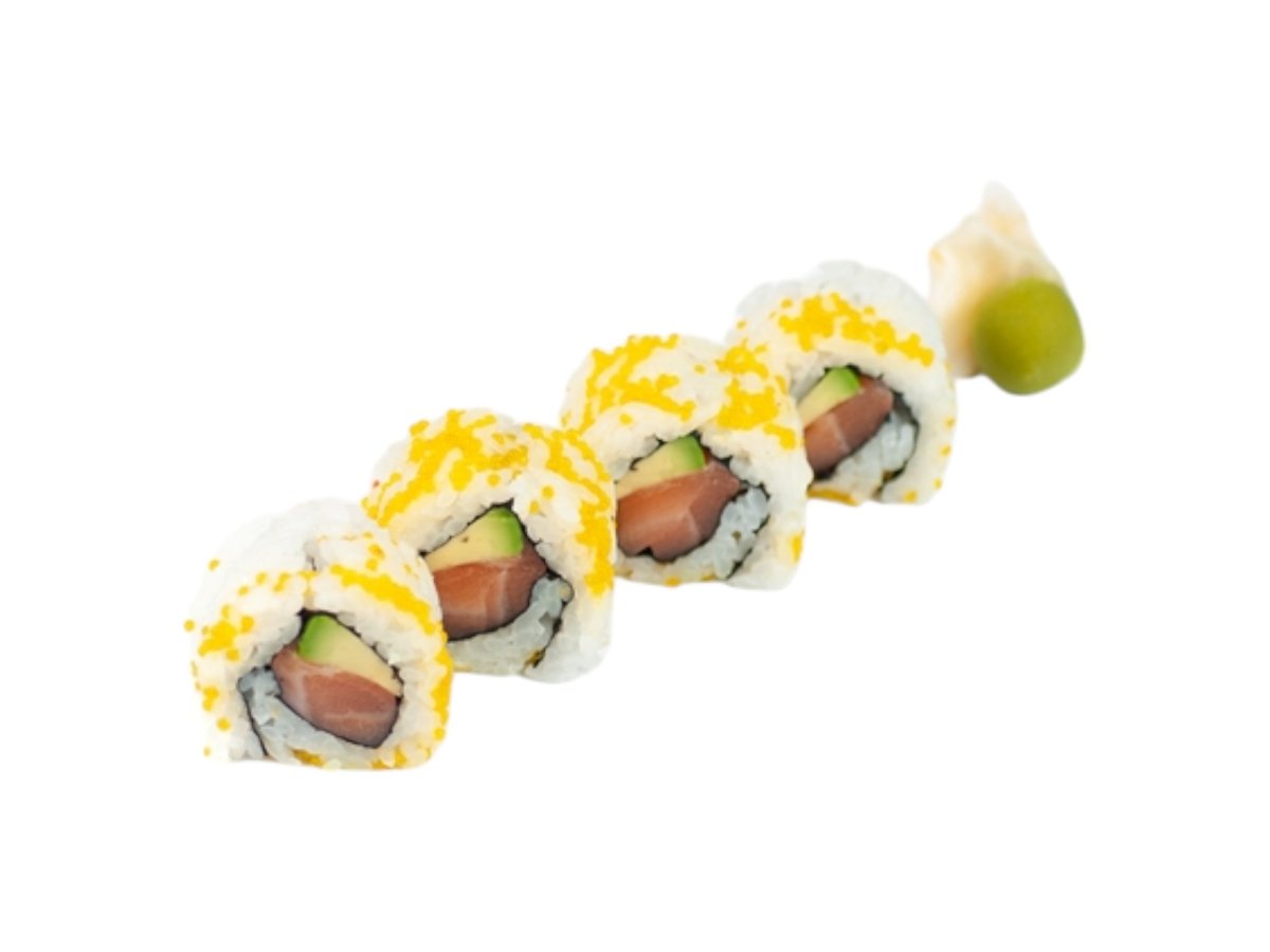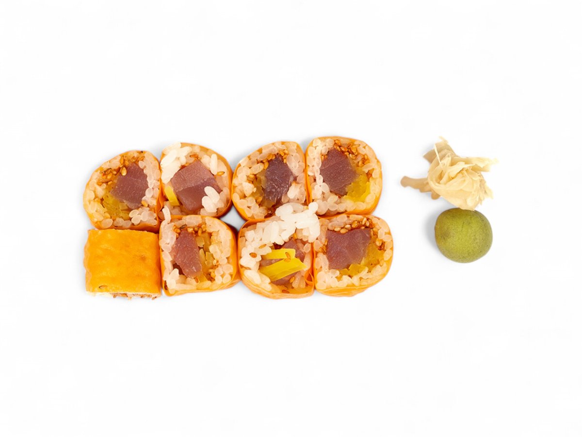 8 броя, ориз, нори, запечен тон, краставица, авокадо, японска майонеза, хайвер от летяща риба, към всяка порция има джинджифил 220г