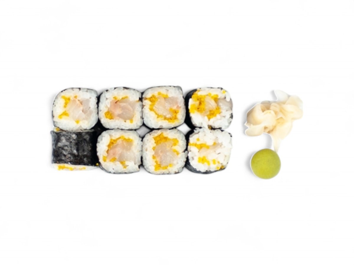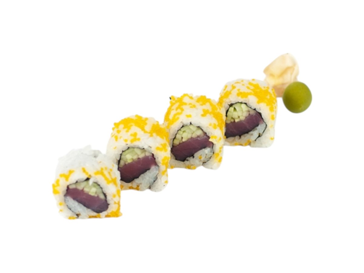 4 броя, ориз, нори, прясна риба тон, краставица, хайвер от летяща риба, към всяка порция има джинджифил, уасаби и соев сос 110г