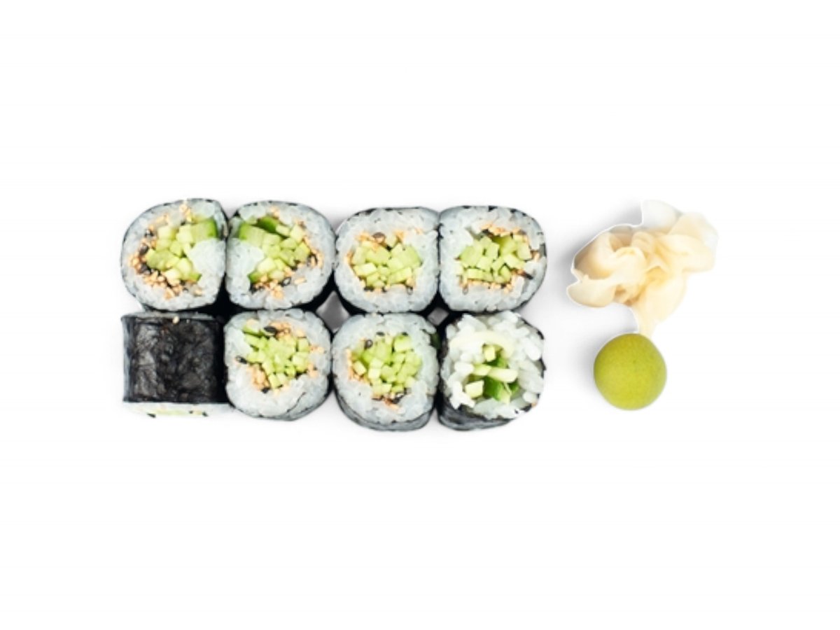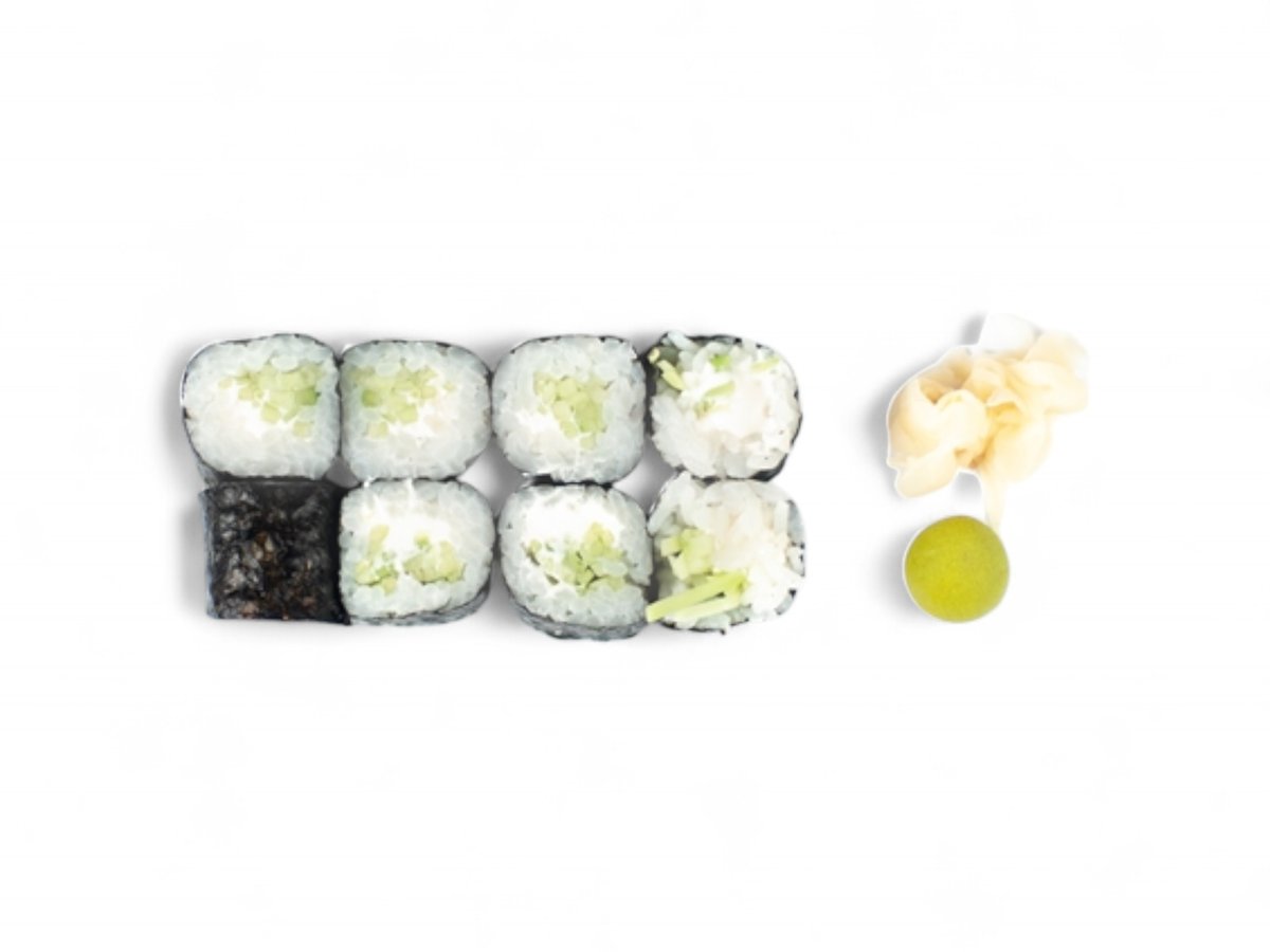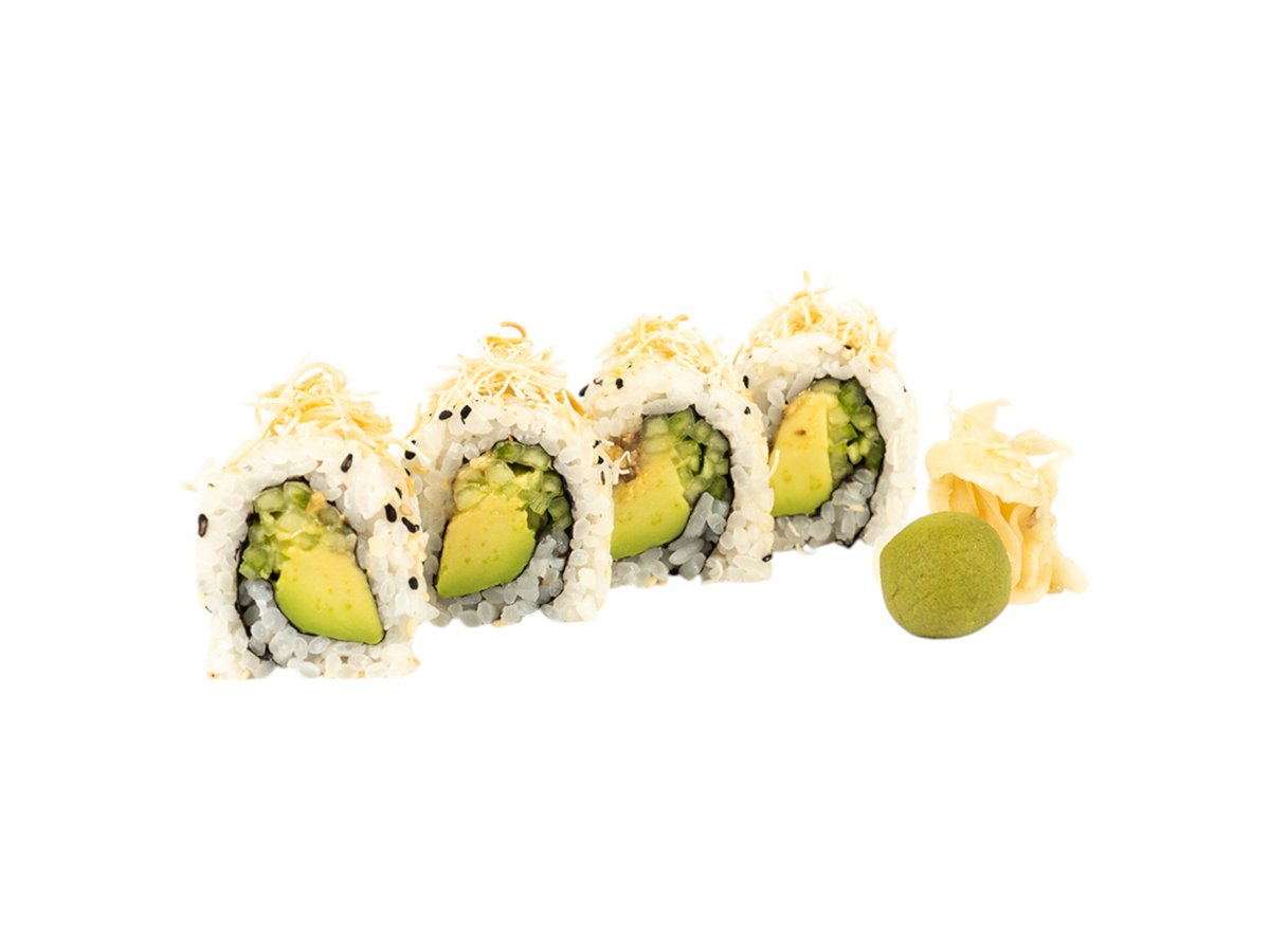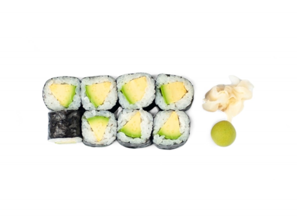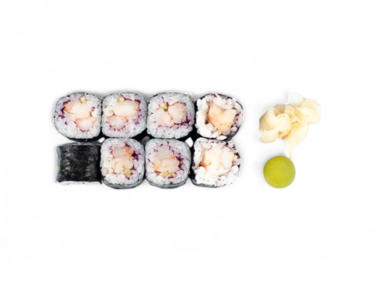 8 броя, ориз, нори, краставица, авокадо, скариди "Еби", към всяка порция има джинджифил, уасаби и соев сос 200г