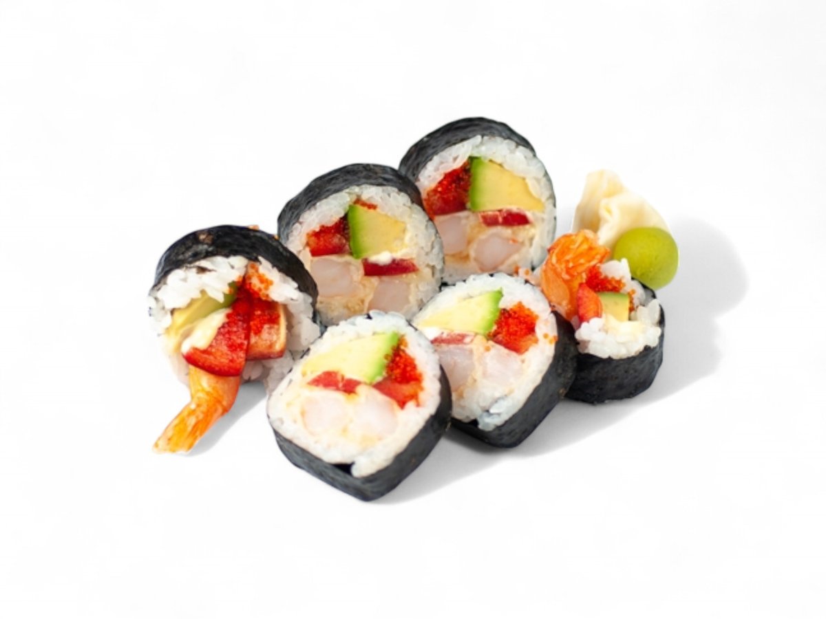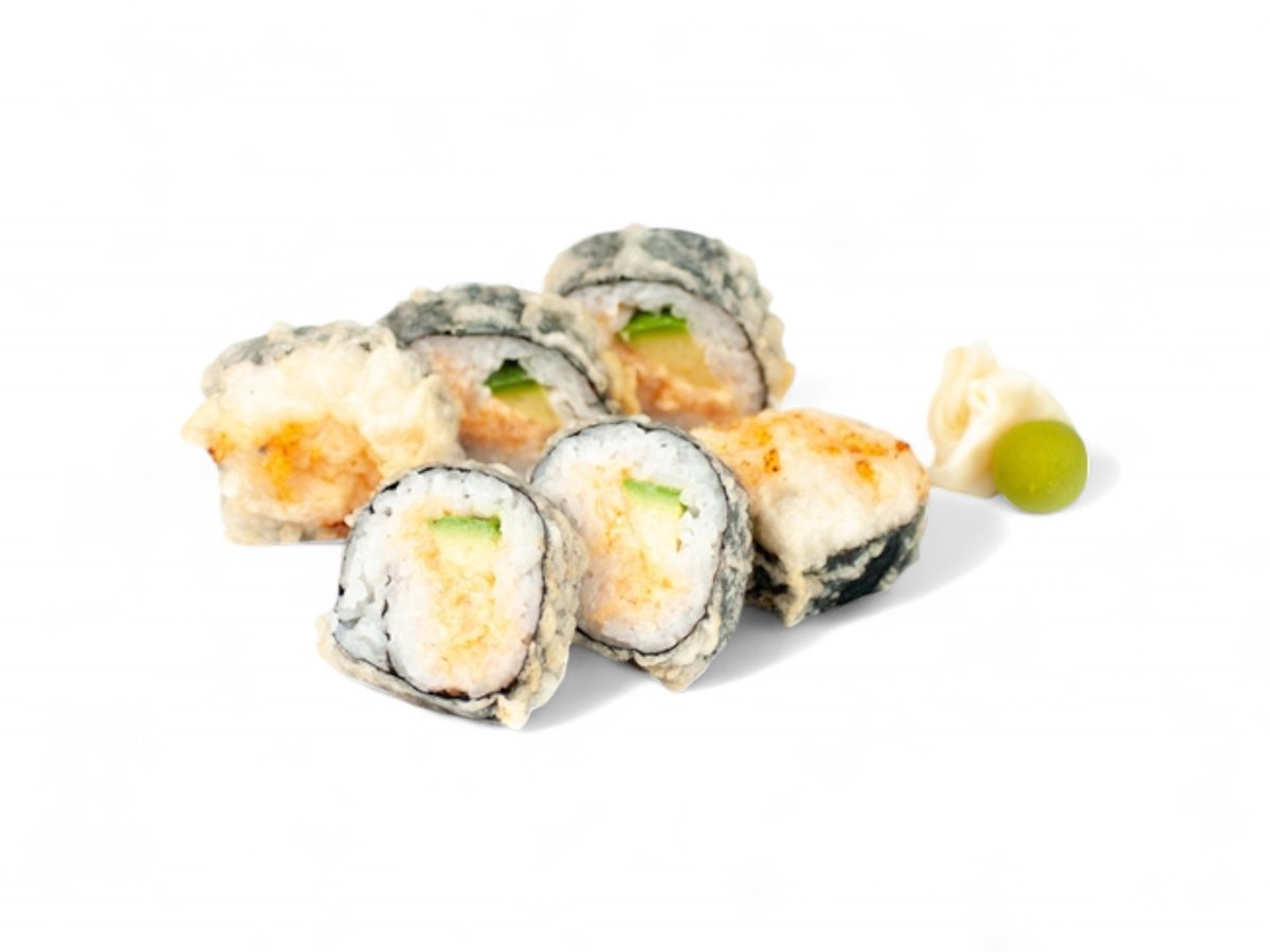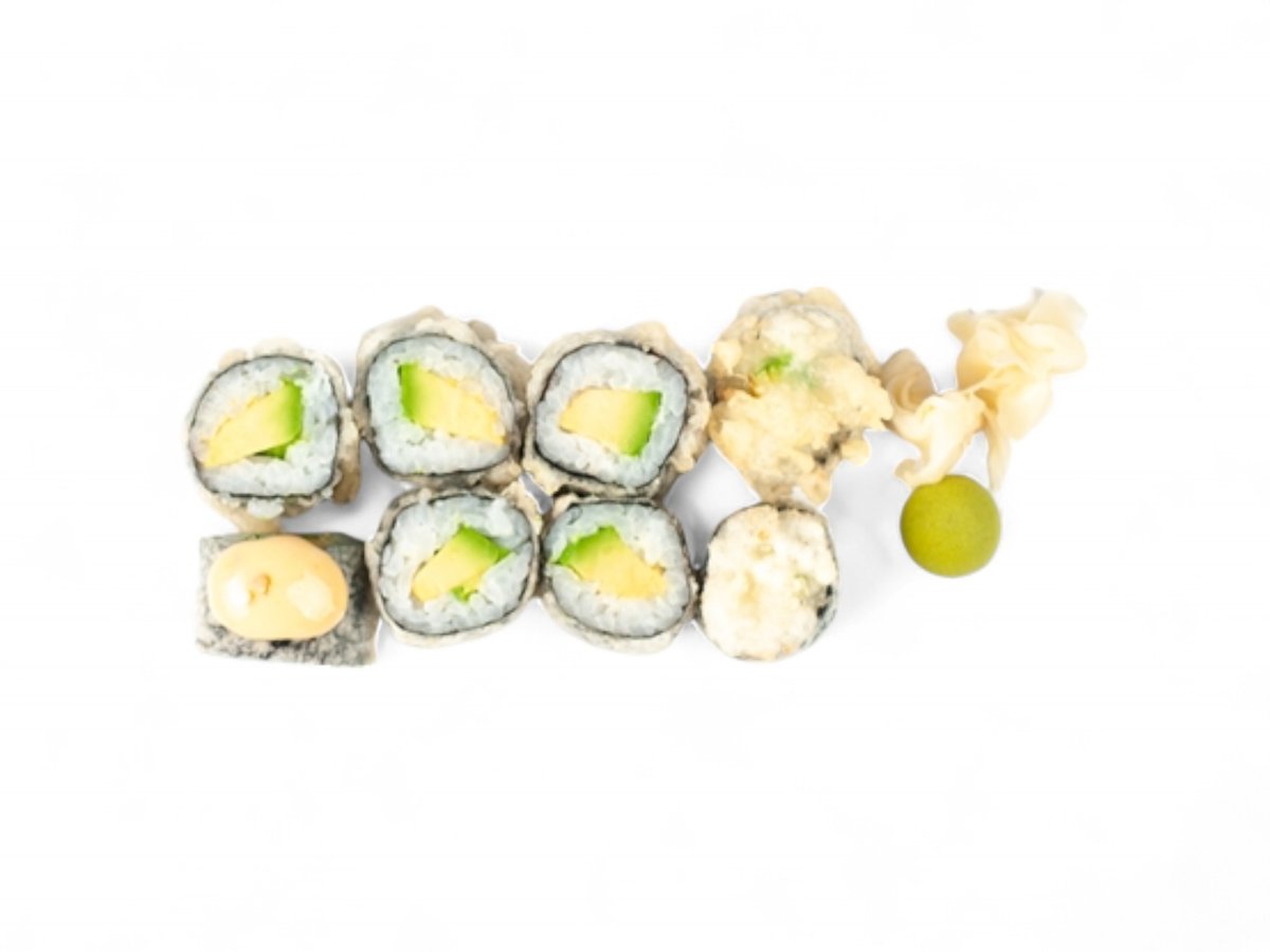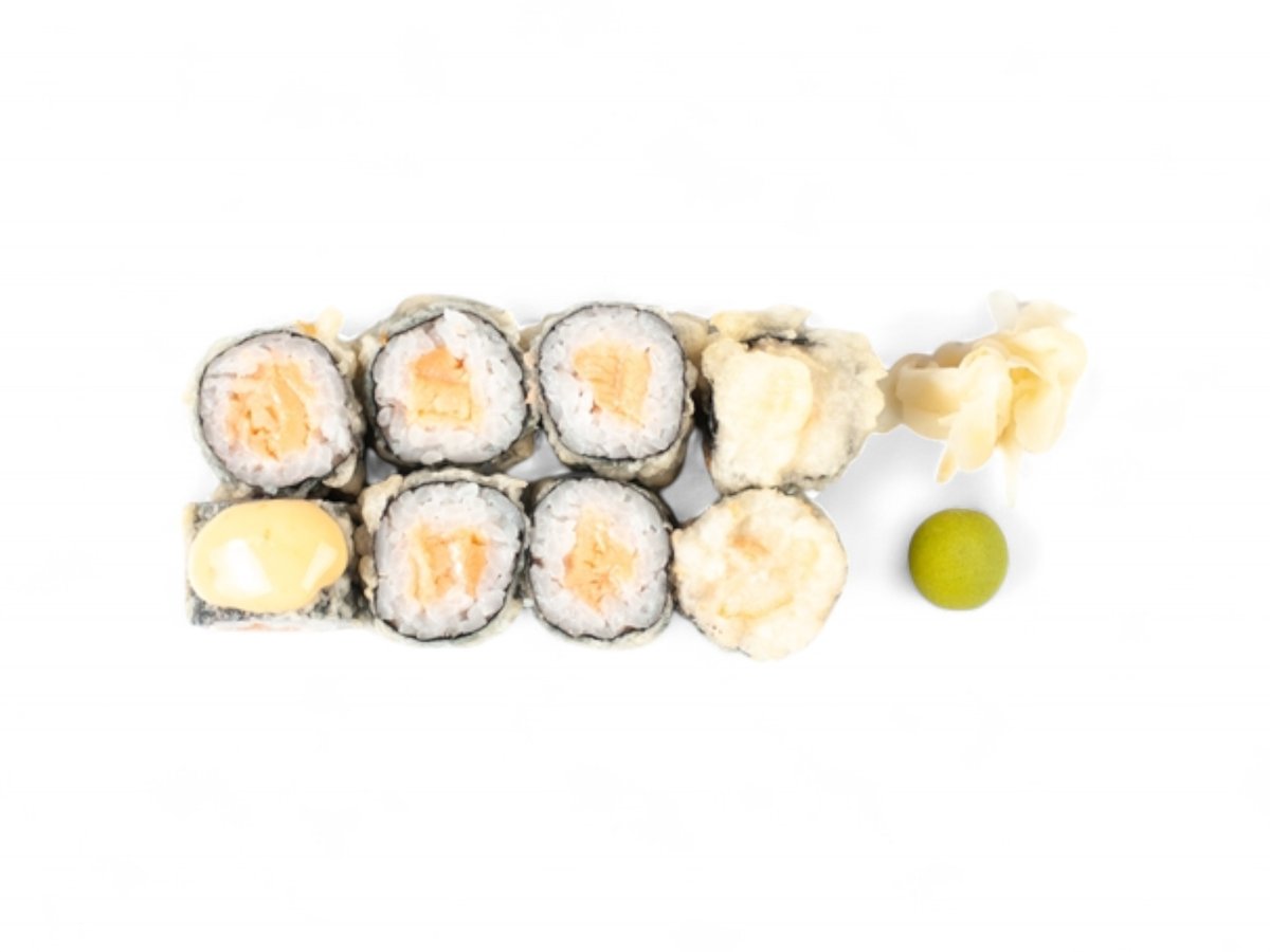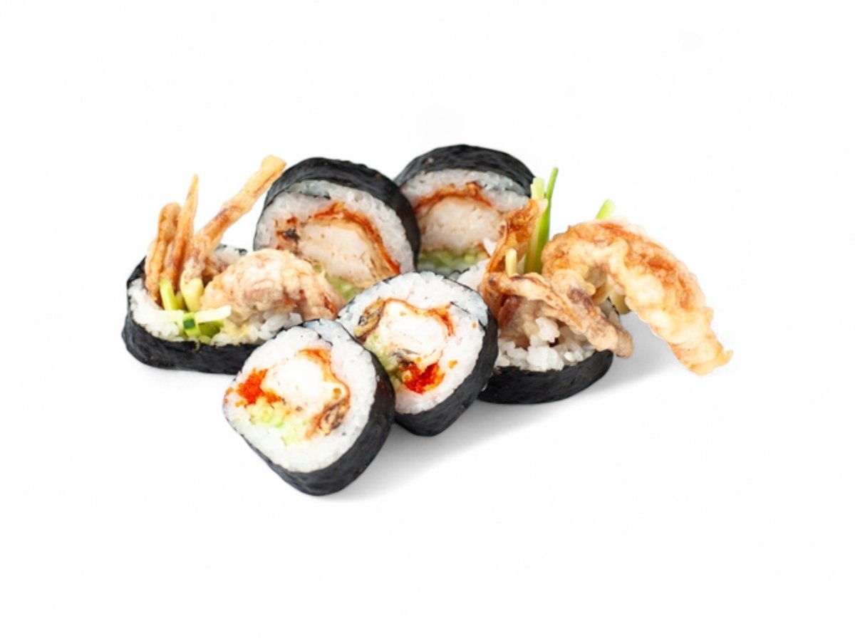 8 броя, ориз, нори, скарида в панировка темпура, краставица, аеро манго, японска майонеза към всяка порция има джинджифил, уасаби и соев сос 220г
