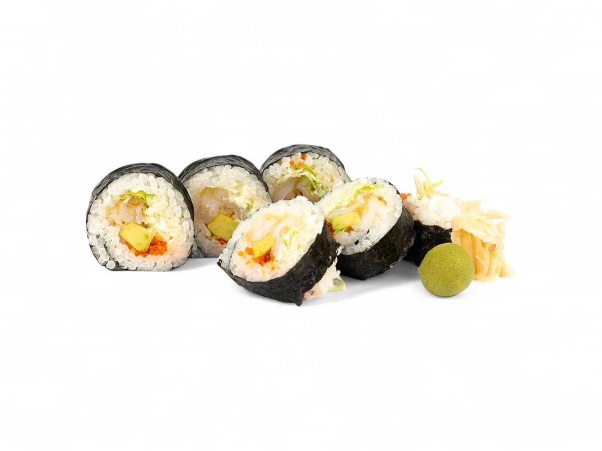 8 броя, ориз, нори, авокадо, бейби калмари в темпура, краставици, японска майонеза 200г