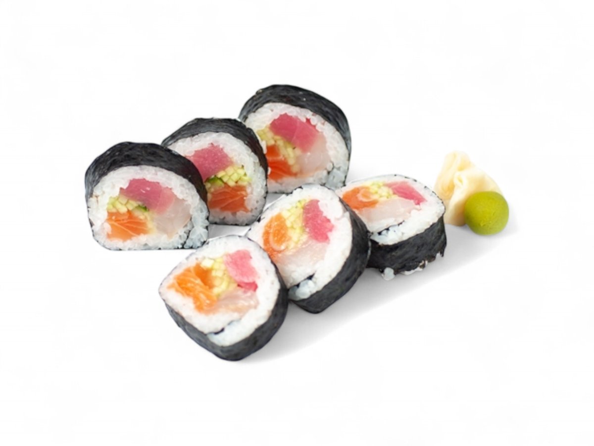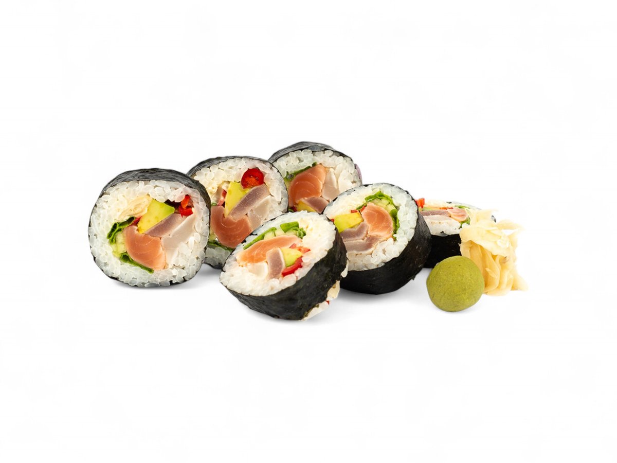 8 броя, ориз, нори, авокадо, краставица, скарида, сьомга, тон, лаврак, към всяка порция има джинджифил, уасаби и соев сос 220г