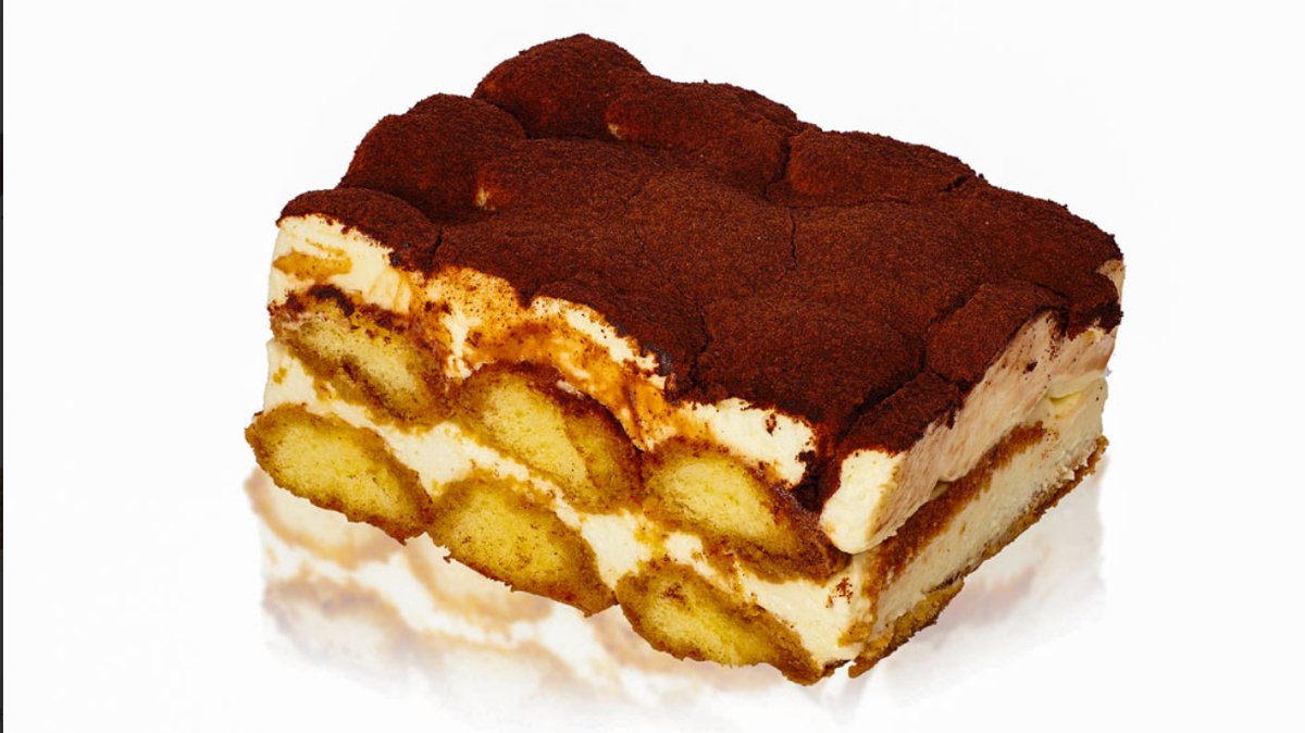 Италиански бишкоти „Савоярди”, потопени в ароматно кафе и бадемов ликьор Амарето, покрити с нежен крем с маскарпоне и поръсени с ароматно какао.