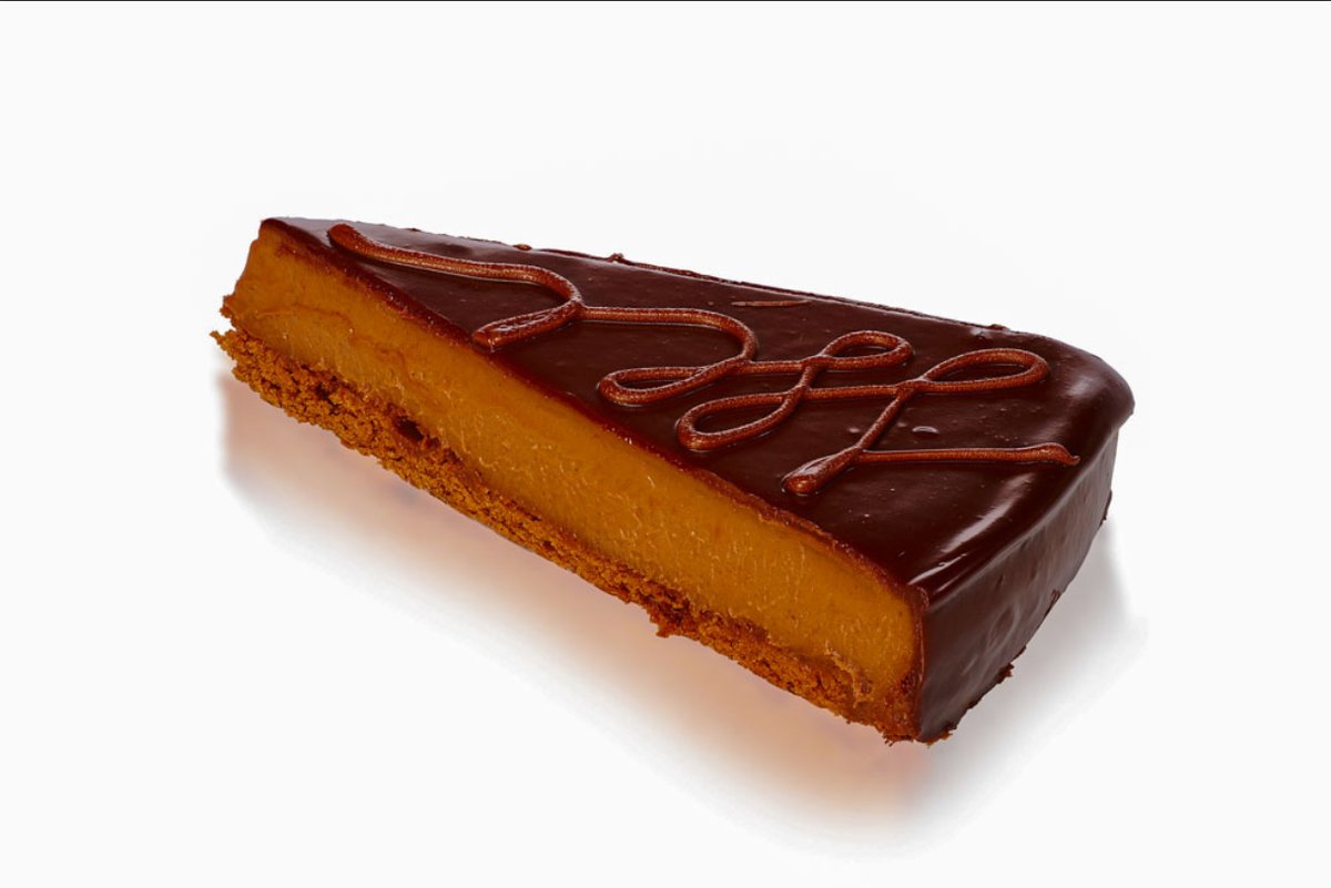 Гладък ганаш от три вида шоколад и млечна сметана върху мек шоколадов блат, поляти с тъмна шоколадова заливка.