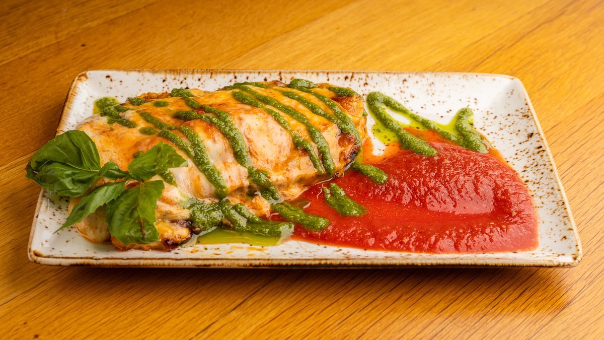патладжан, печени чушки, сушени домати, домат конкасе, чесън, босилек, моцарела, пармезан, доматен сос, песто Дженовезе, 300г