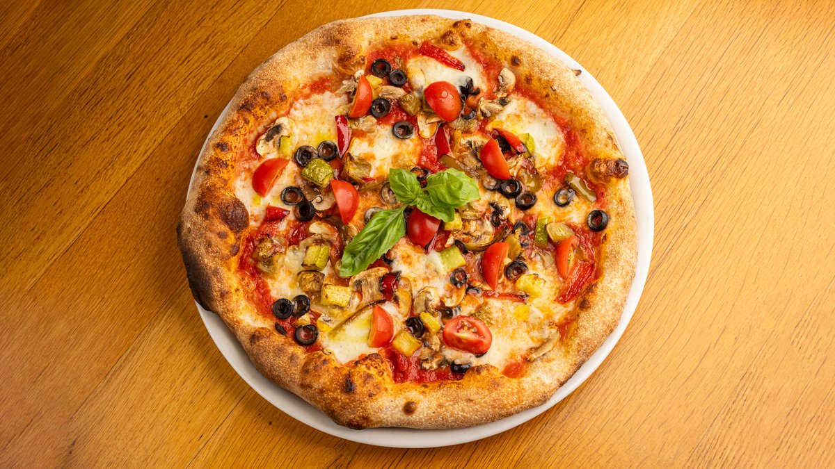 доматен сос, моцарела, гъби, патладжан, тиквички, чушки и чери домати 450г