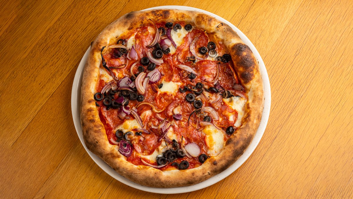 доматен сос, моцарела, пикантен салам, червен лук и маслини 450г