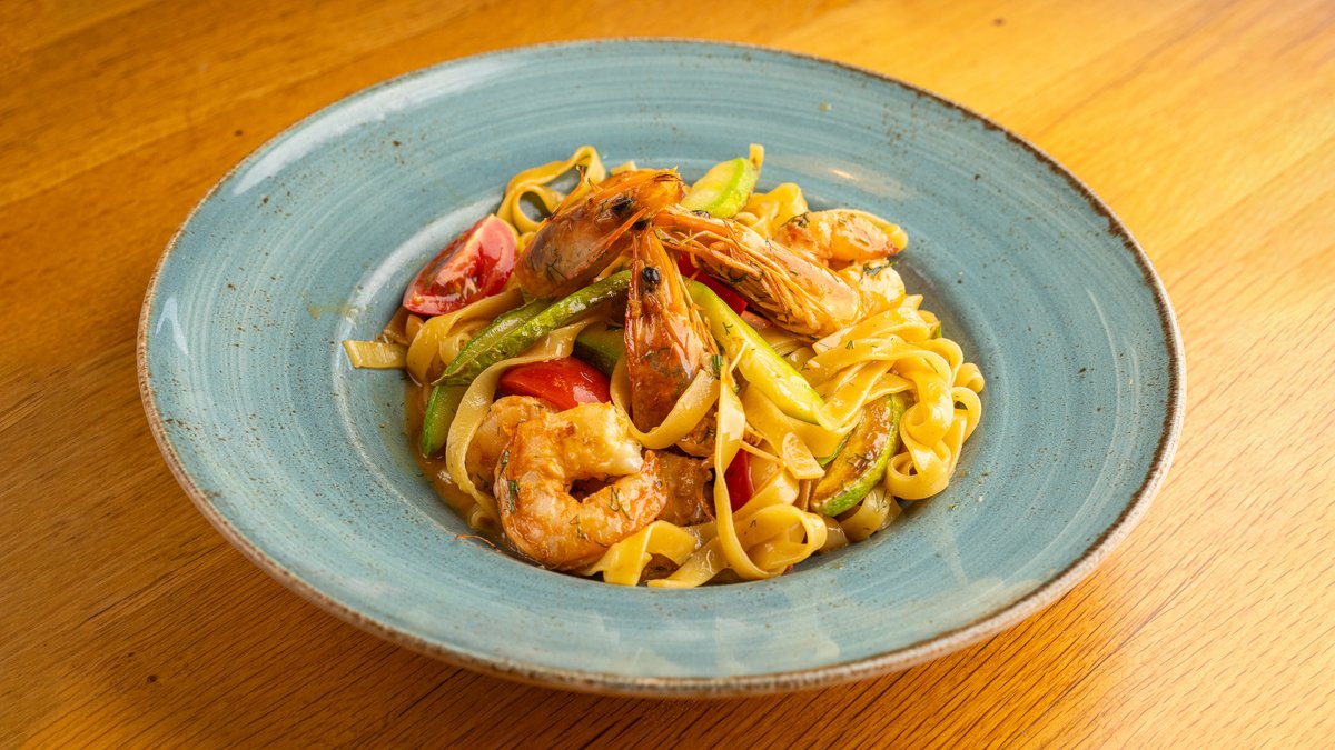 скариди, бяло вино Росиди, краве масло, фенел, чесън, чили, копър, биск, 250г