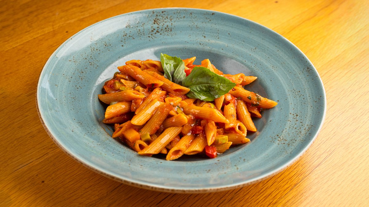 пълнозърнеста паста, доматен сос с билков зехтин, сезонни зеленчуци, чесън, лук, свежи градински билки, чери домати, 350г