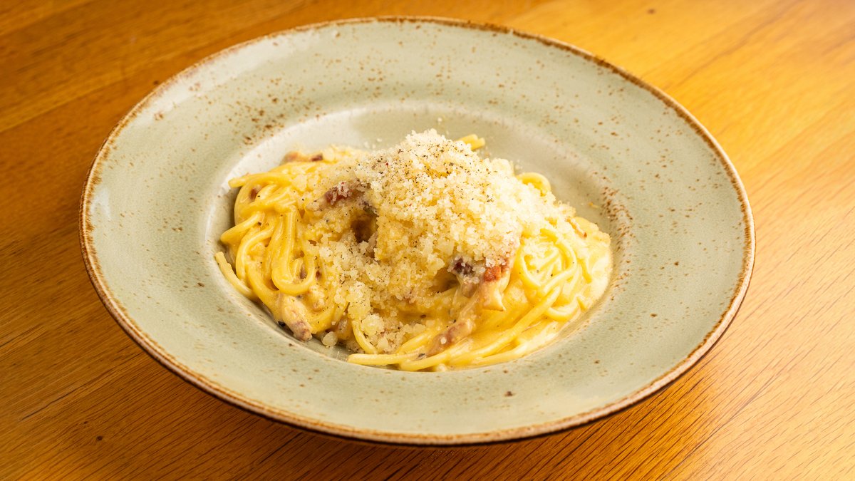 спагети, панчета, яйчен жълтък, грана падано, черен пипер, 250г