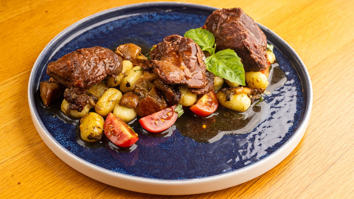 бавно сготвени телешки бузи,крем полента,масло,сол,черен пипер,свежи зеленолистни салати