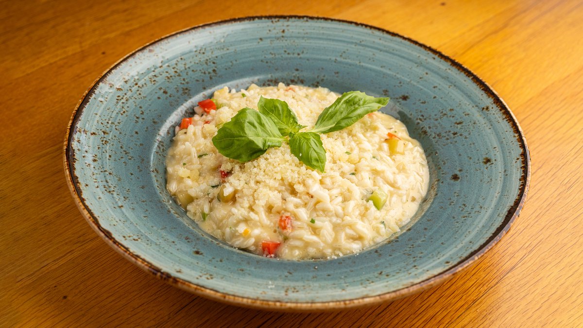 карнароли ориз, лук, чесън, сезонни зеленчуци, билков зехтин, масло, Грана Падано, босилек, магданоз, 350г
