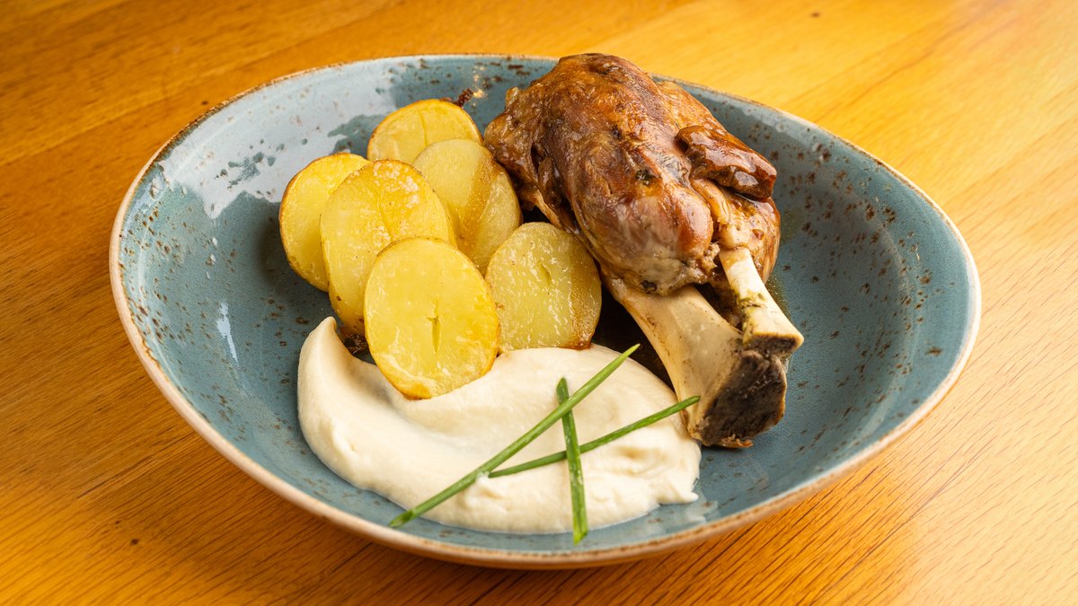свински джолан с кост, печен картоф, пушен пипер, пюре от целина, печен сос, градински билки, 400г