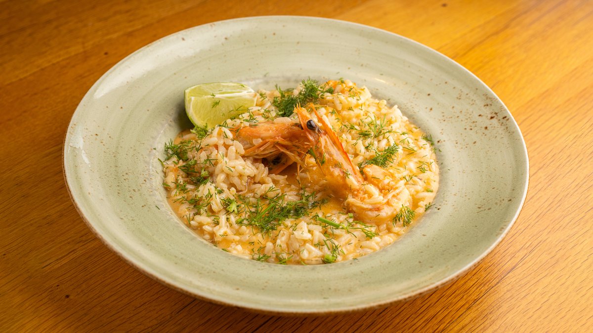 арборио ориз, лук, чесън, скариди, миди, кокосово мляко, масло, фенел, 350г