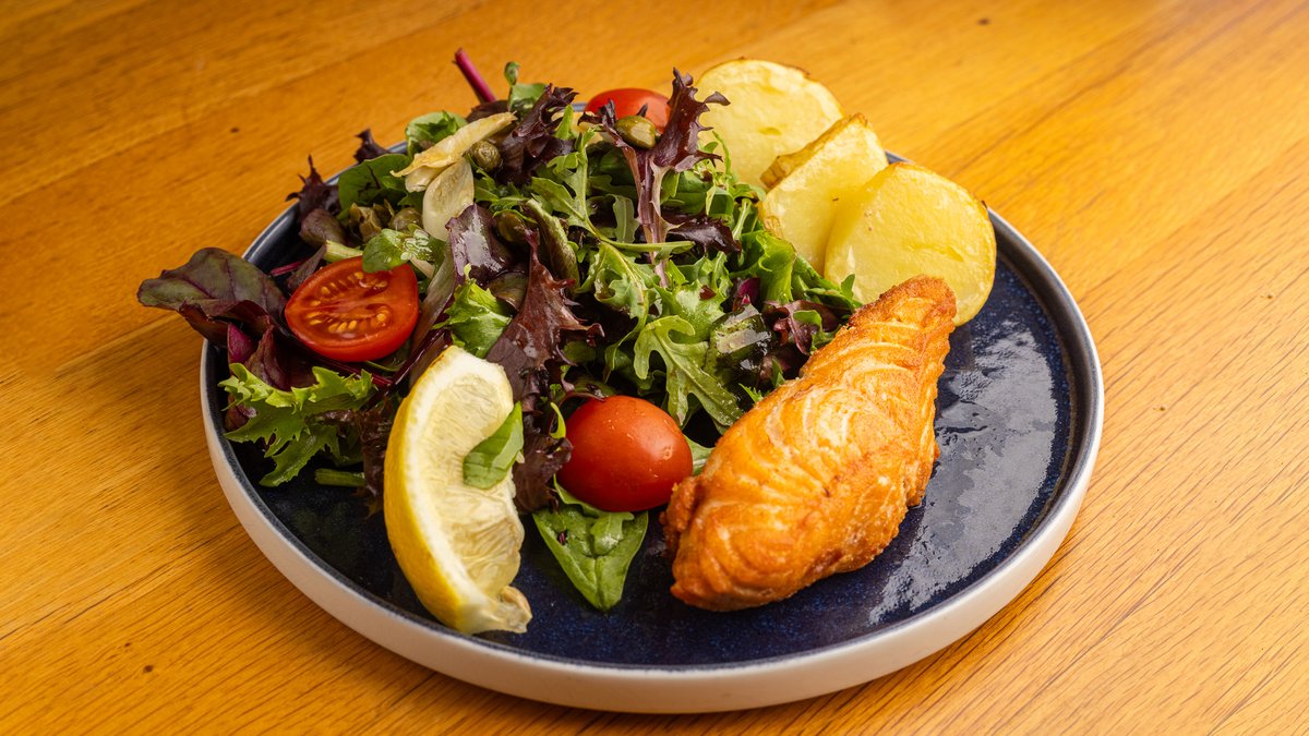 грилована сьомга гарнирана със свежа салата, цитрус, чери домати, картоф
