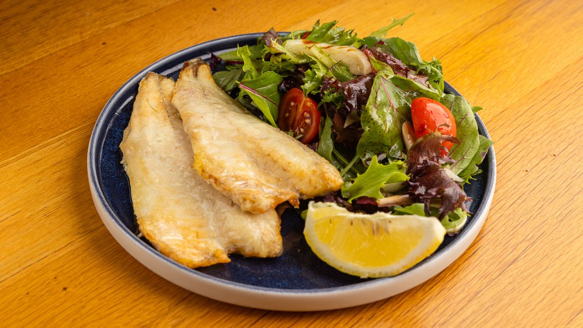 лаврак на плоча, микс от листни салати, чери домати, фенел, лимонов дресинг и зехтин, 350г