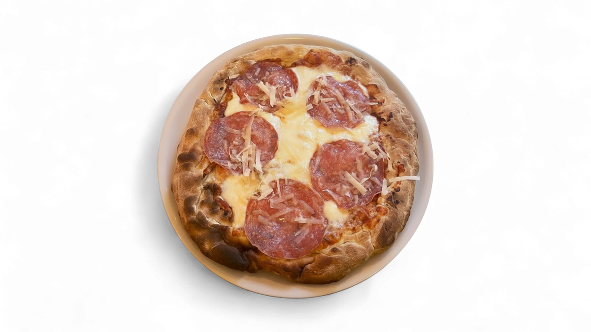 доматен сос, моцарела, пикантен салам, лют зехтин.