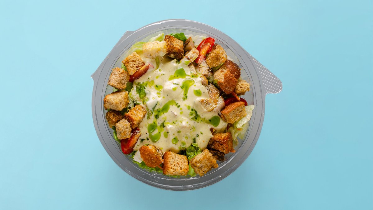 микс от зелени салати, моркови, чери домати, авокадо, пилешко филе, пармезан, песто и сос "Цезар"