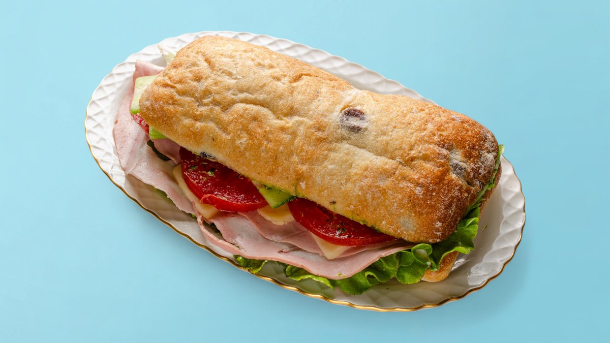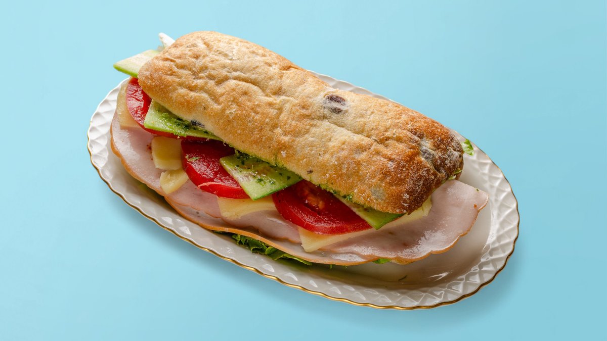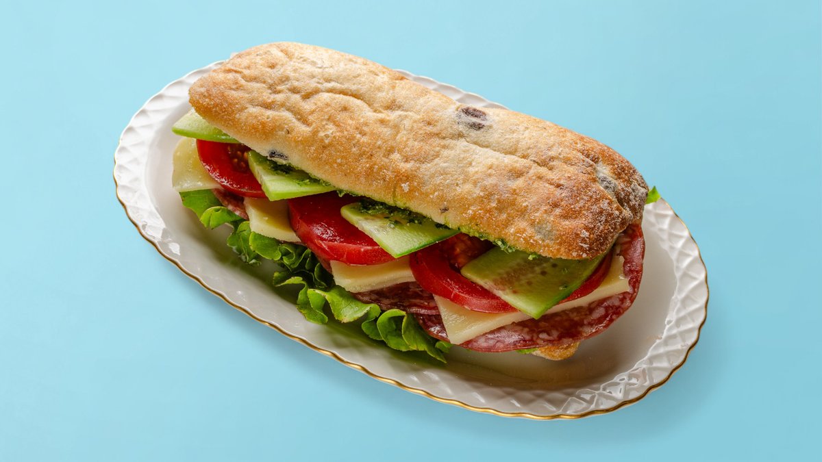 прясно изпечена чабата с италиански колбас Копа, хумус, топено сирене, кашкавал, домати, краставици, маруля