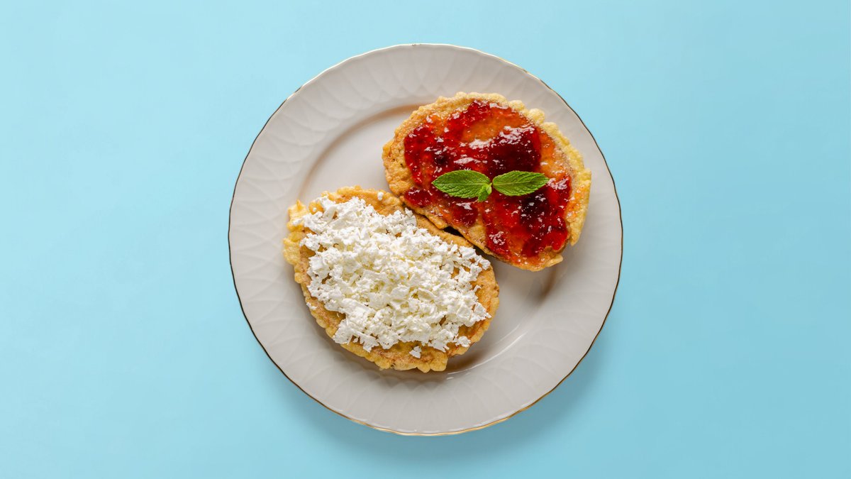 вкусни пържени филийки с краве сирене и сладко от ягоди, 2 броя