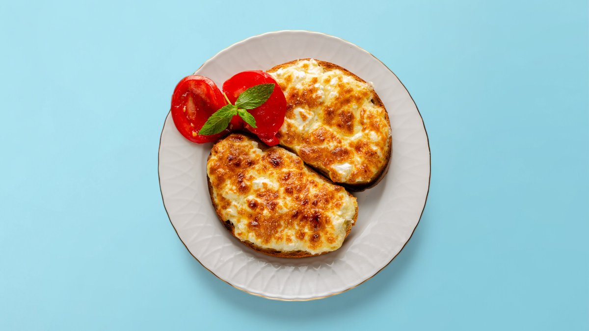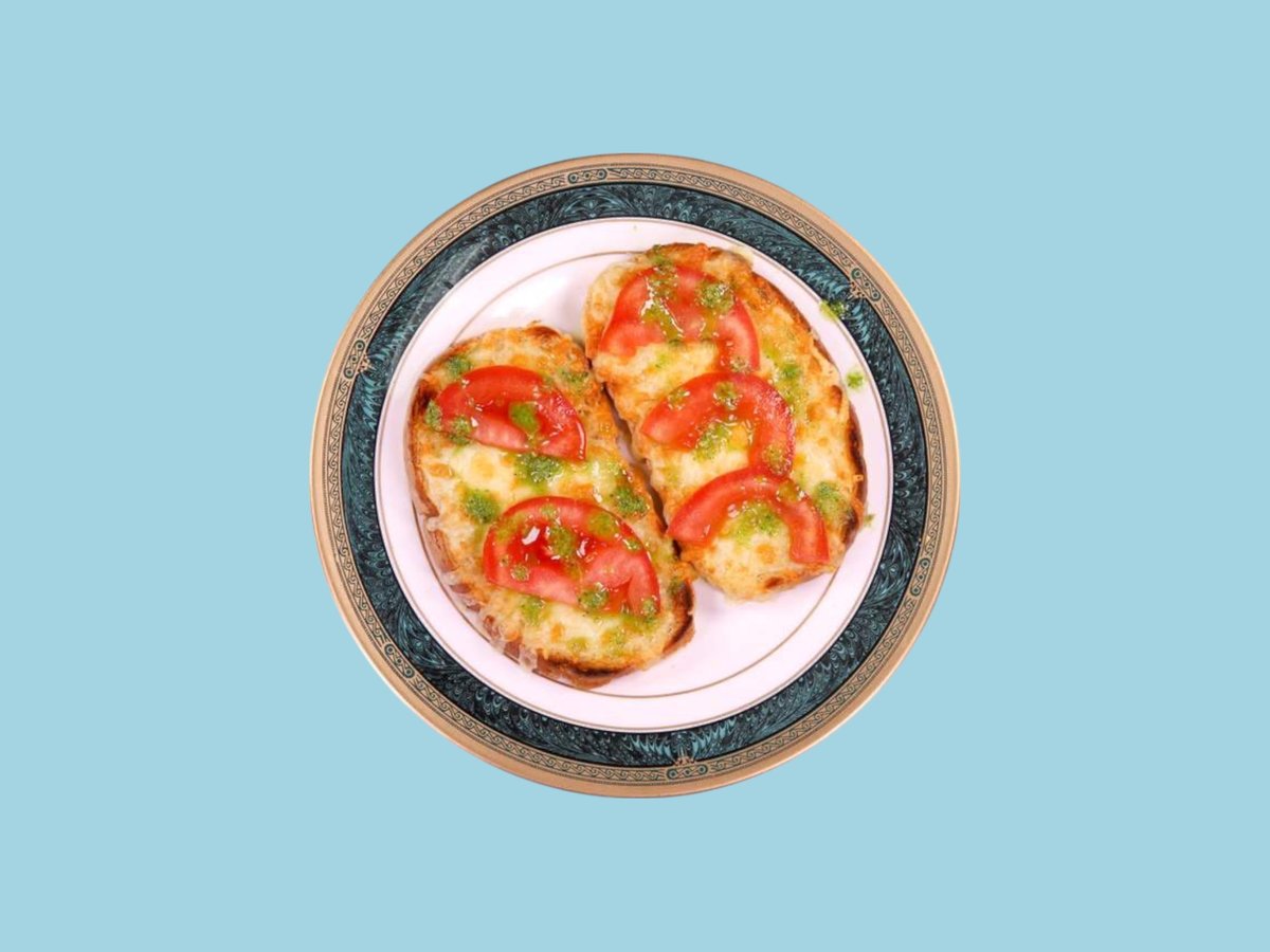 прясно изпечена чабата, намазана с маслинова паста, топено сирене и моцарела, кашкавал, домати, краставици, маруля