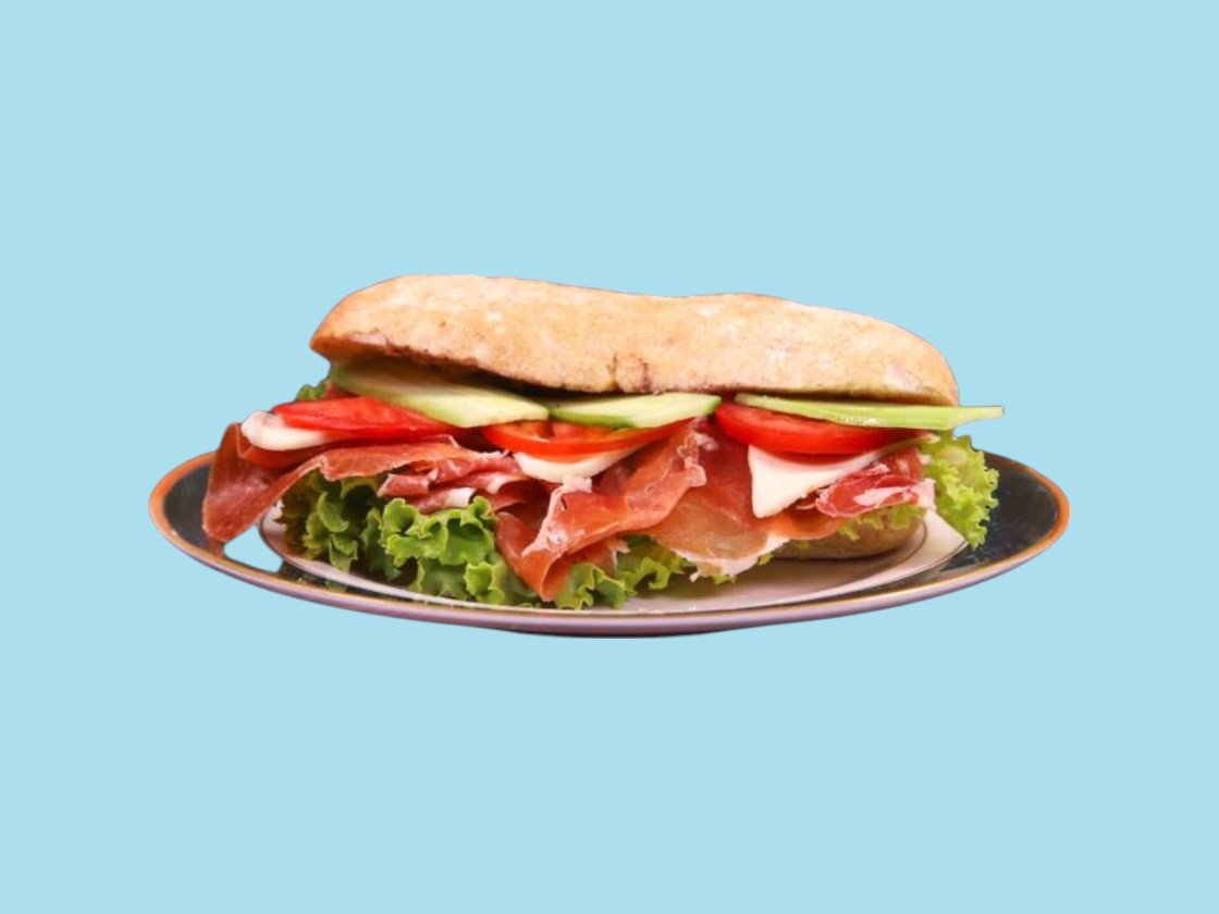 прясно изпечена чабата с прошуто крудо, песто, топено сирене, моцарела, домати, краставици, марули