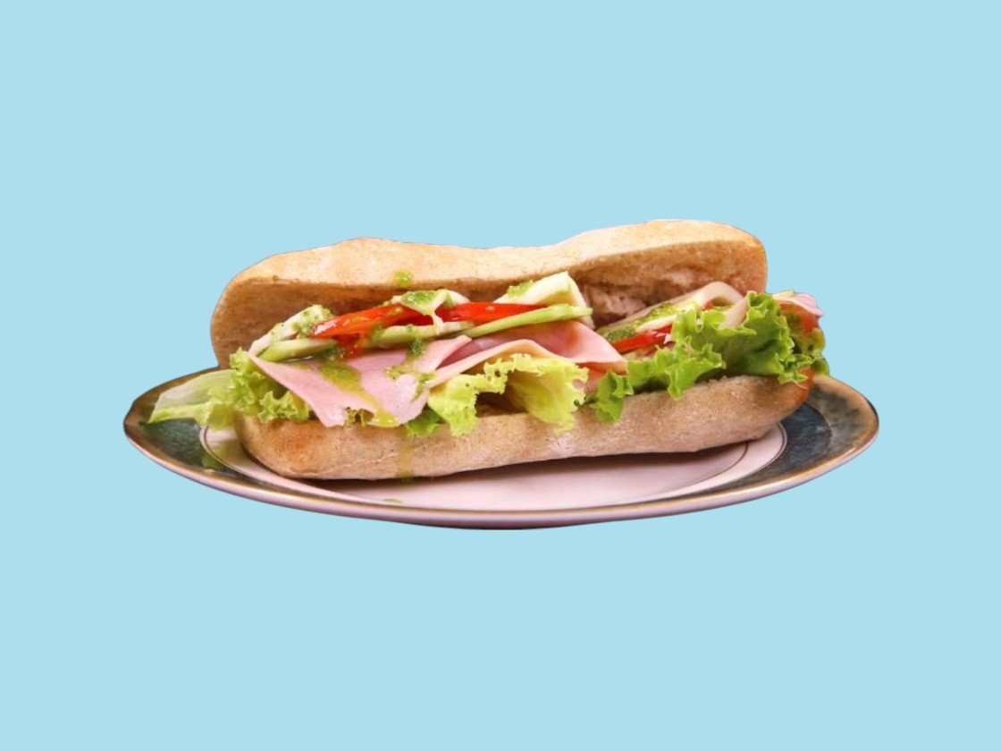 прясно изпечена чабата с италиански колбас Вентричина (пикантен), песто (приготвено от нас на място), топено сирене, кашкавал, домати, краставици, маруля