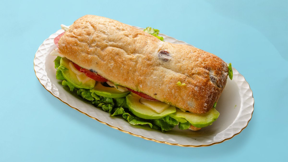 прясно изпечена чабата с веган сос (ядкова майонеза), топено сирене, кашкавал, домати, краставици, маруля