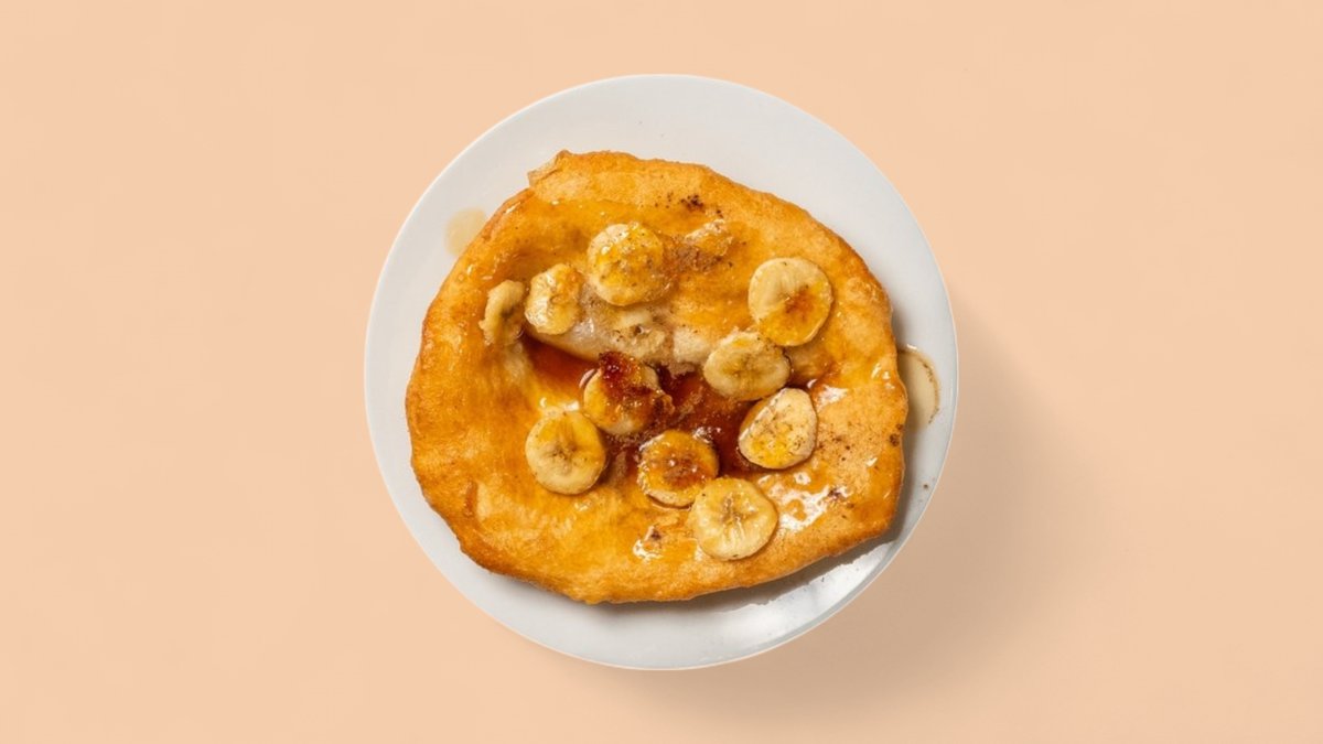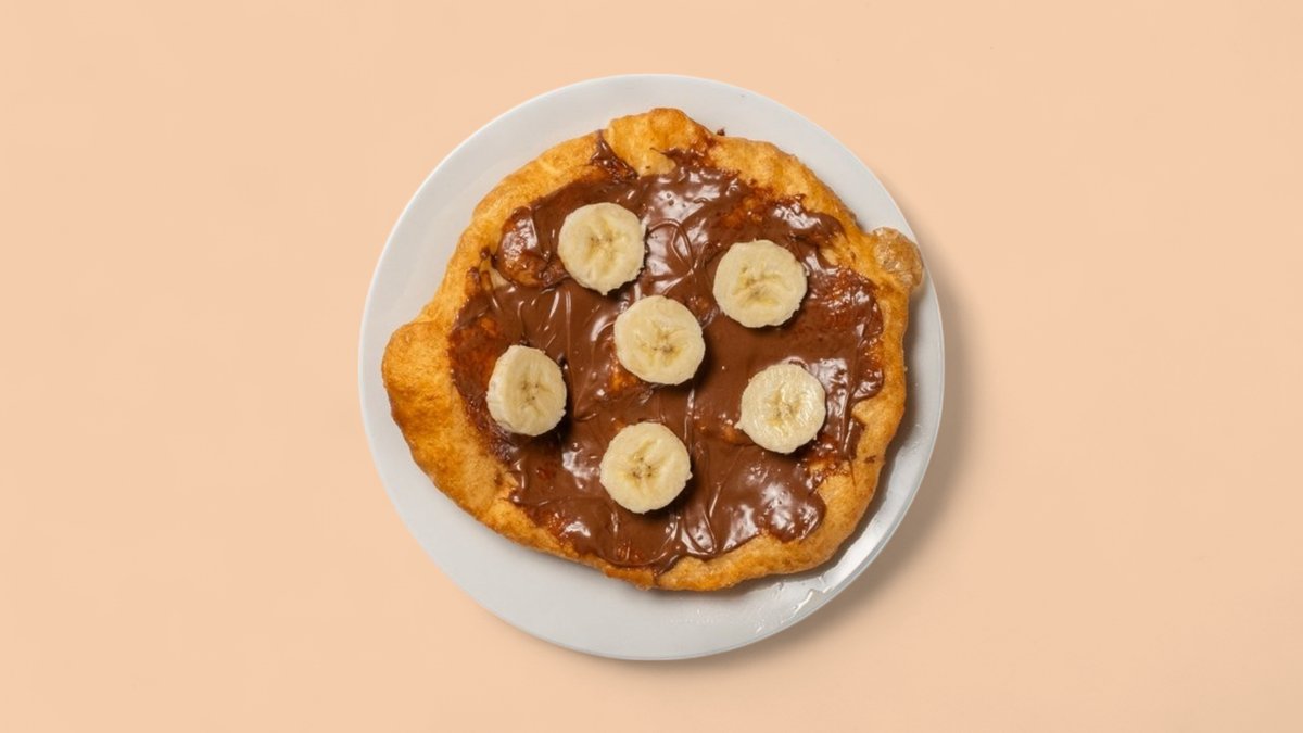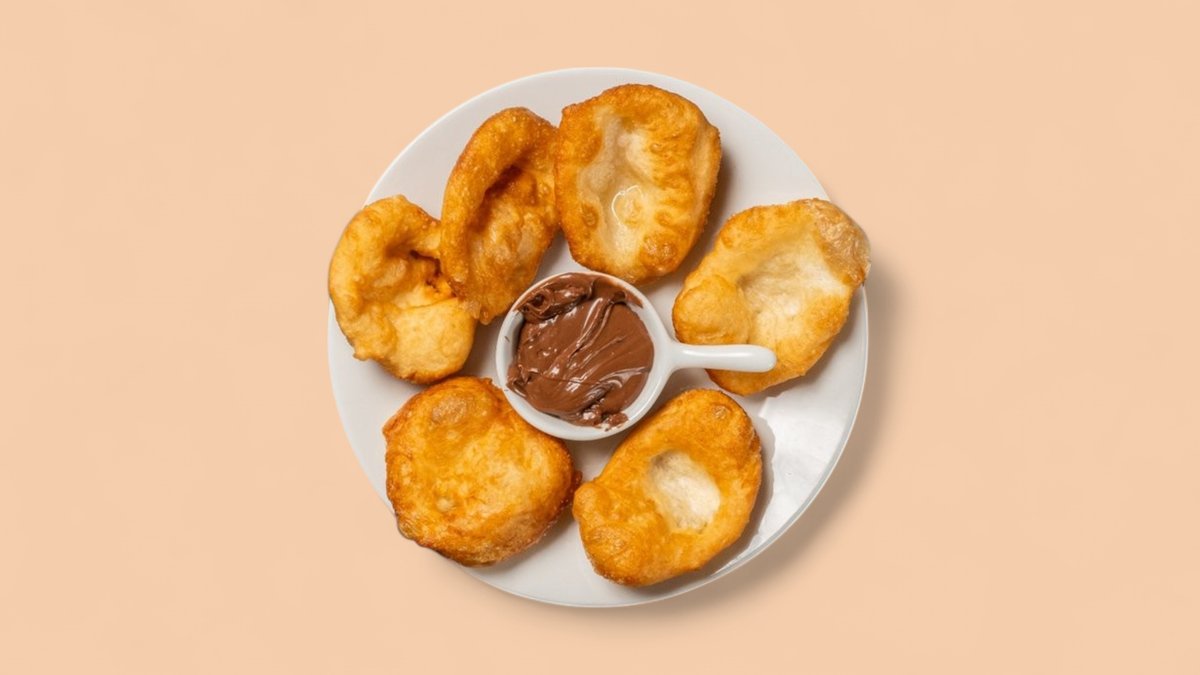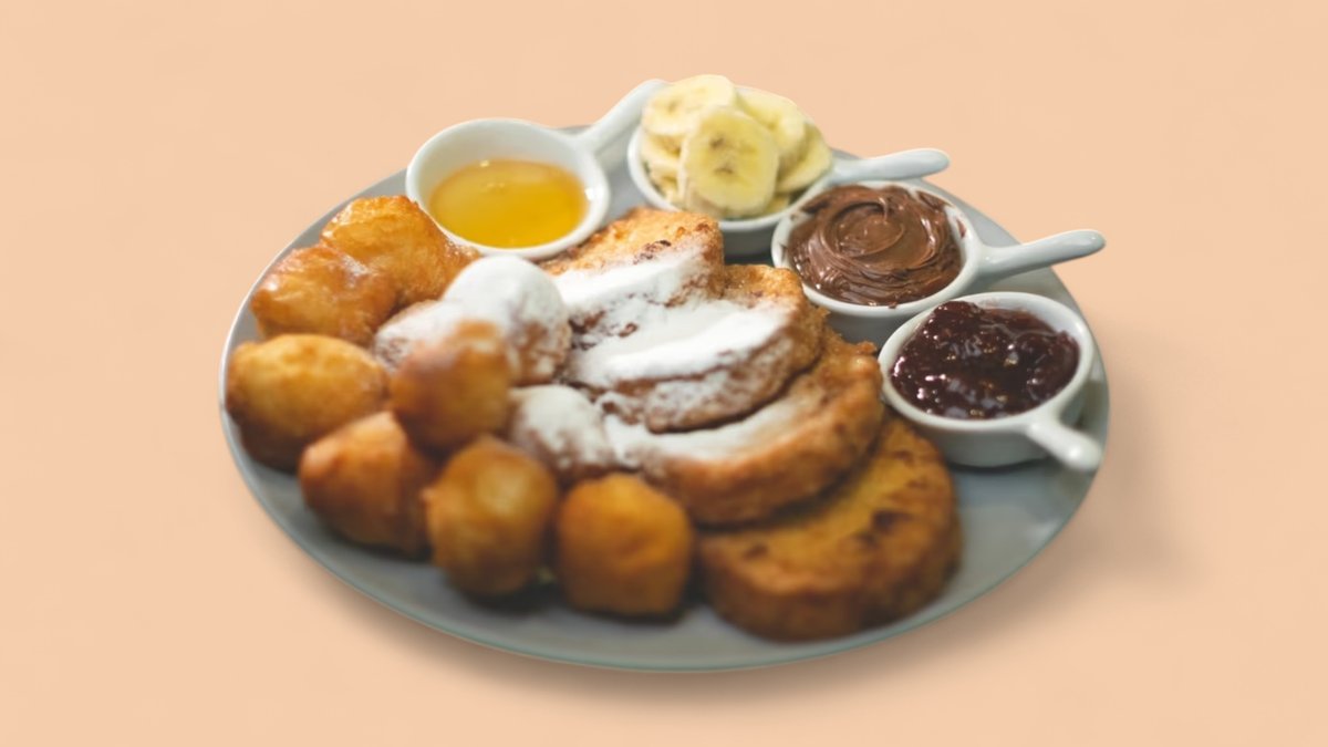 нашата захаросана кутия с 4 пържени филийки и 10 бухтички с пудра захар. Към тях има нутела, мед, сладко от ягоди и нарязан банан