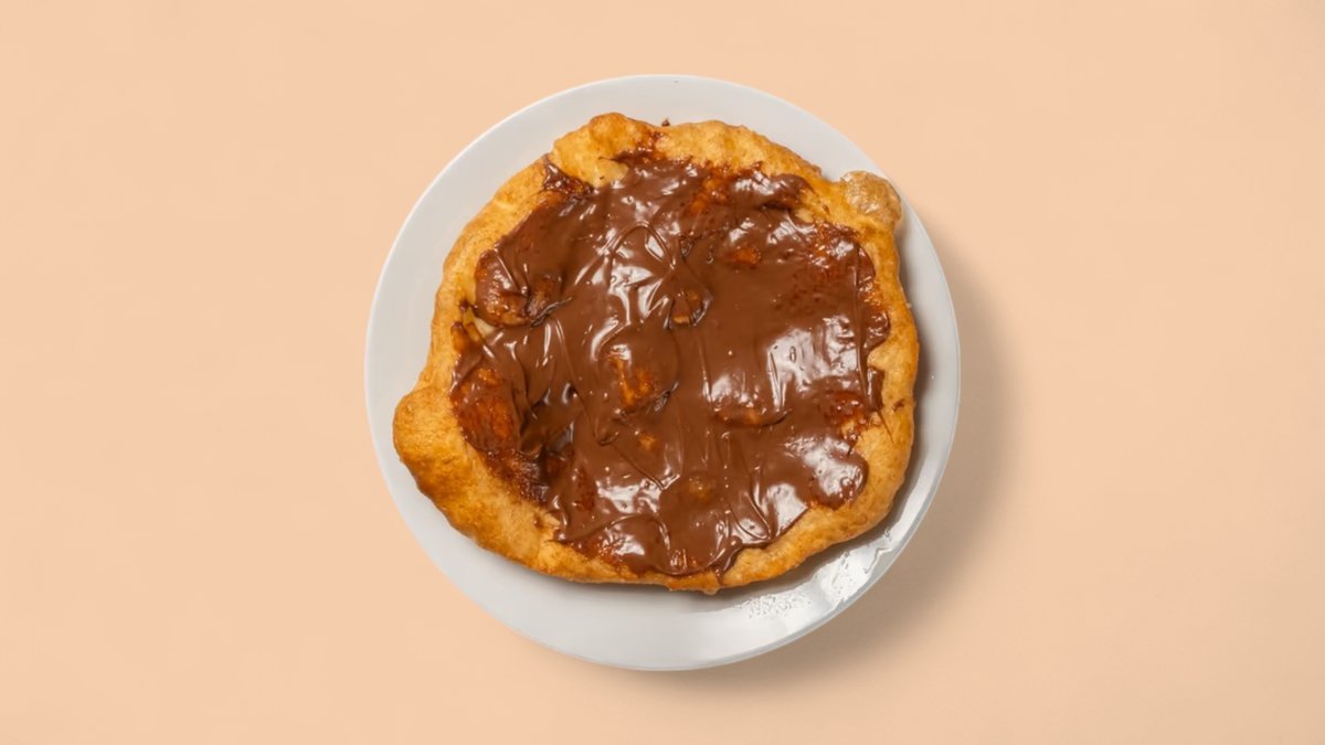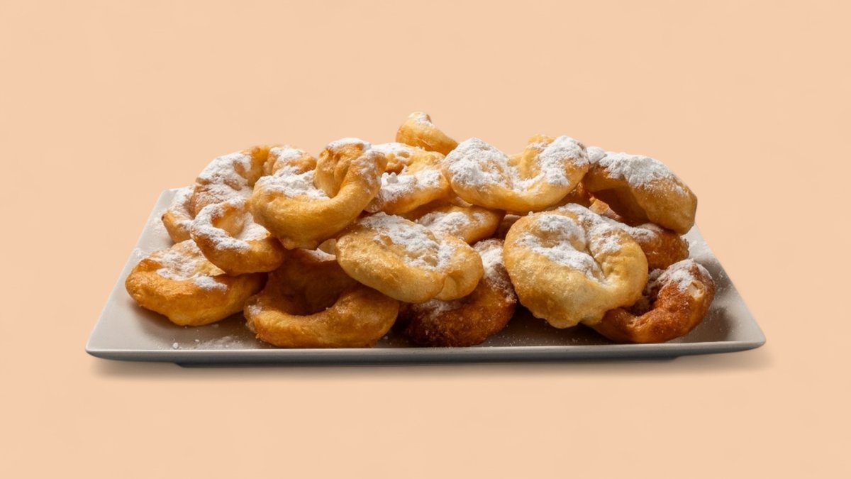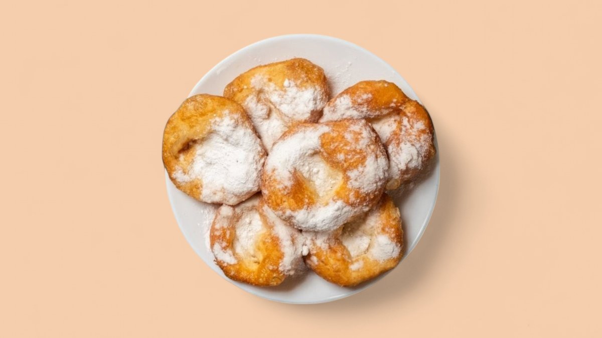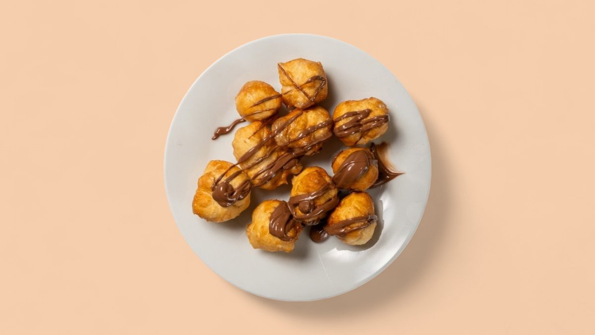 нашата захаросана кутия с 4 пържени филийки и 10 бухтички с пудра захар. Към тях има нутела, мед, сладко от ягоди и нарязан банан