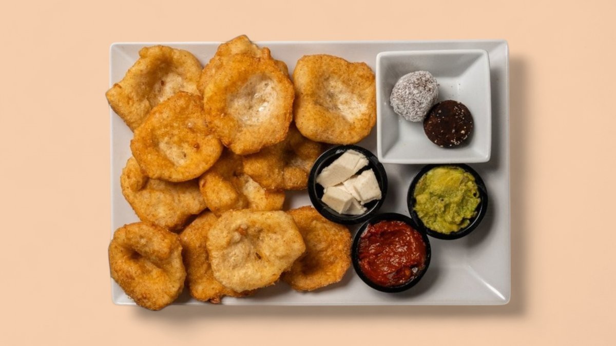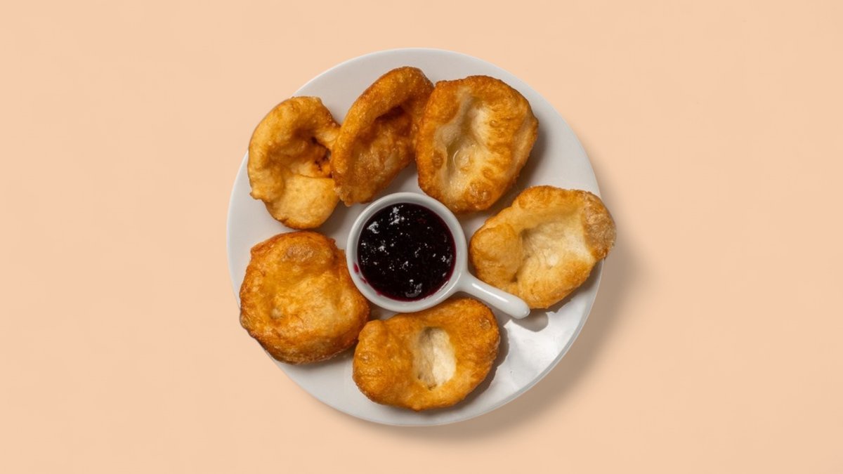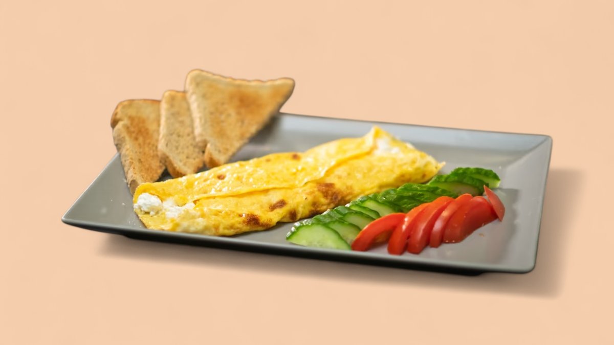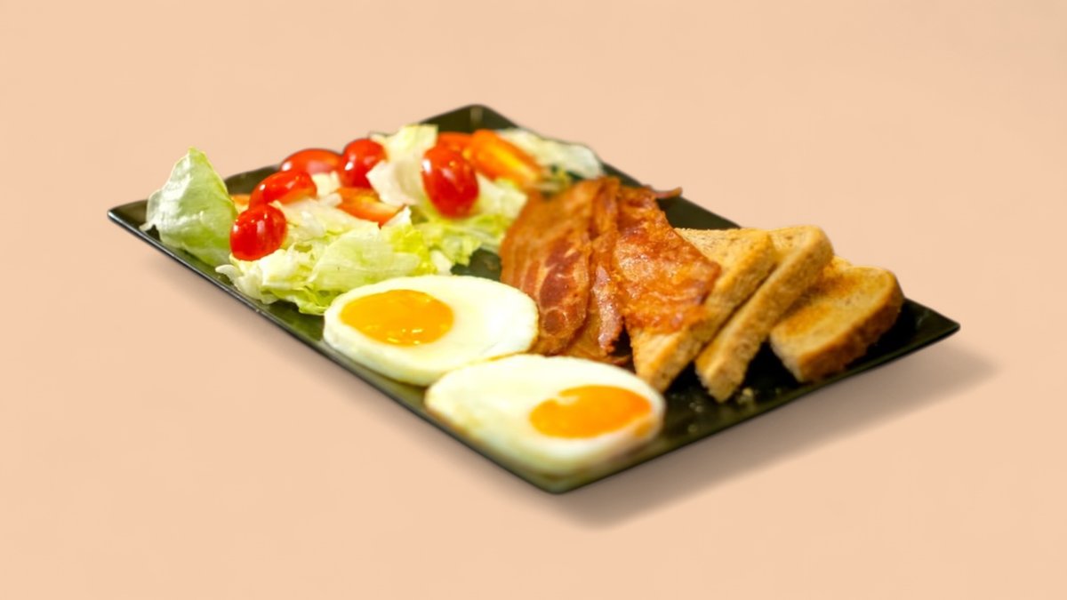 кутия с 10 мини мекички, 2 варени яйца, заляти със сос Холандез, хрупкаво беконче и две кутийки с крема сирене и родопска смес
