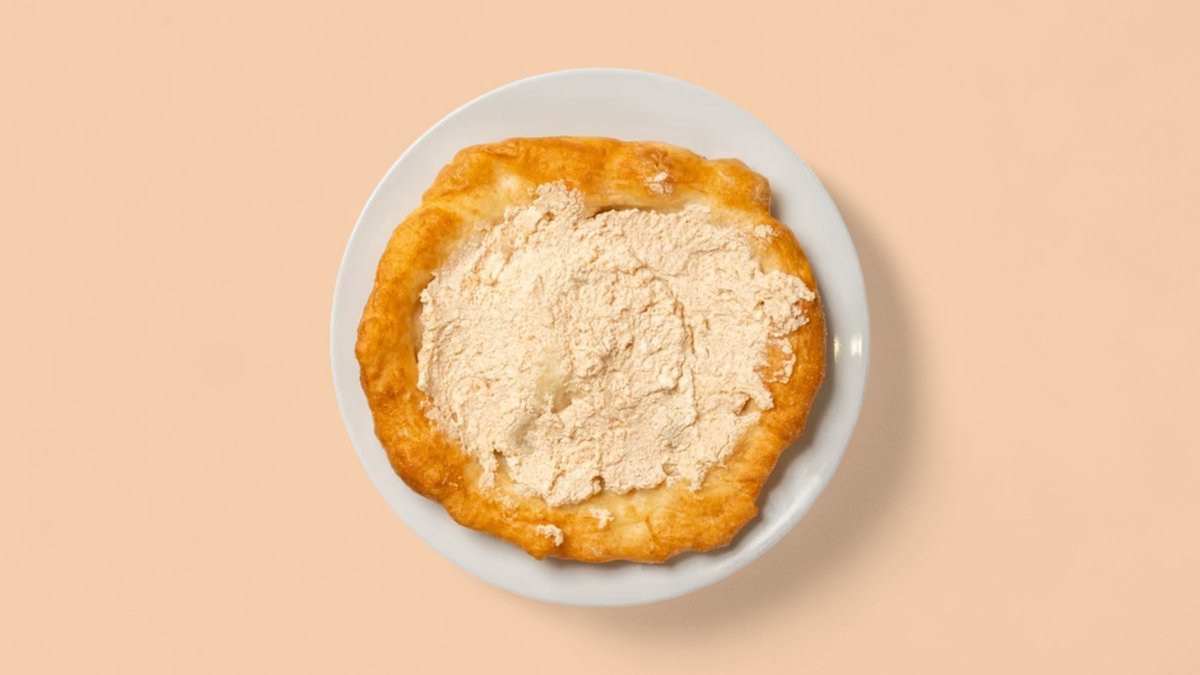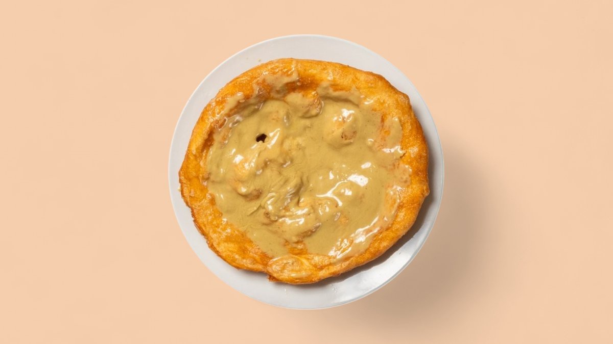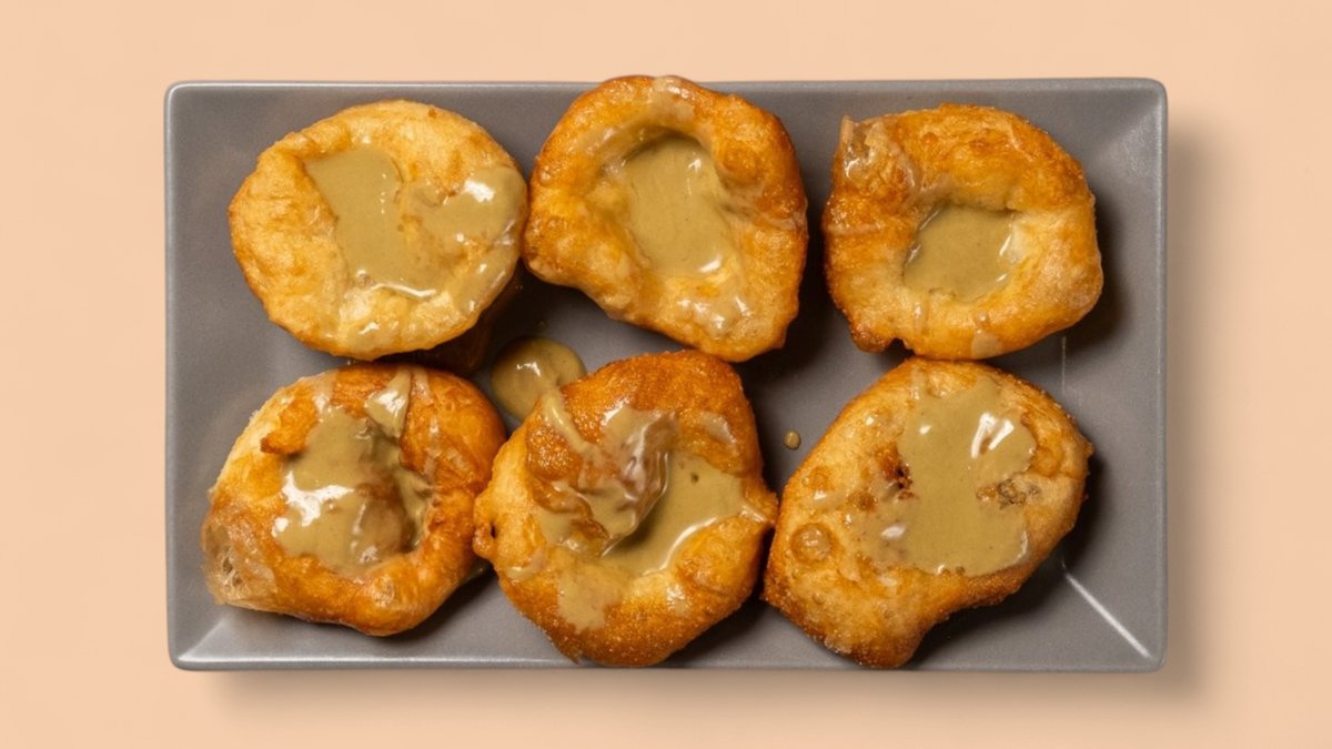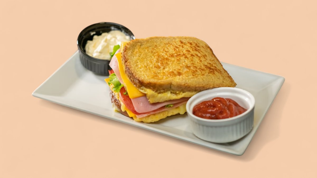кутия с 10 мини мекички, 2 варени яйца, заляти със сос Холандез, хрупкаво беконче и две кутийки с крема сирене и родопска смес
