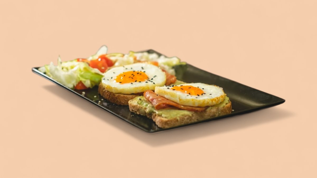 авокадо тост с мус от авокадо, пържен бекон и яйца на очи със зелена салата и черен сусам