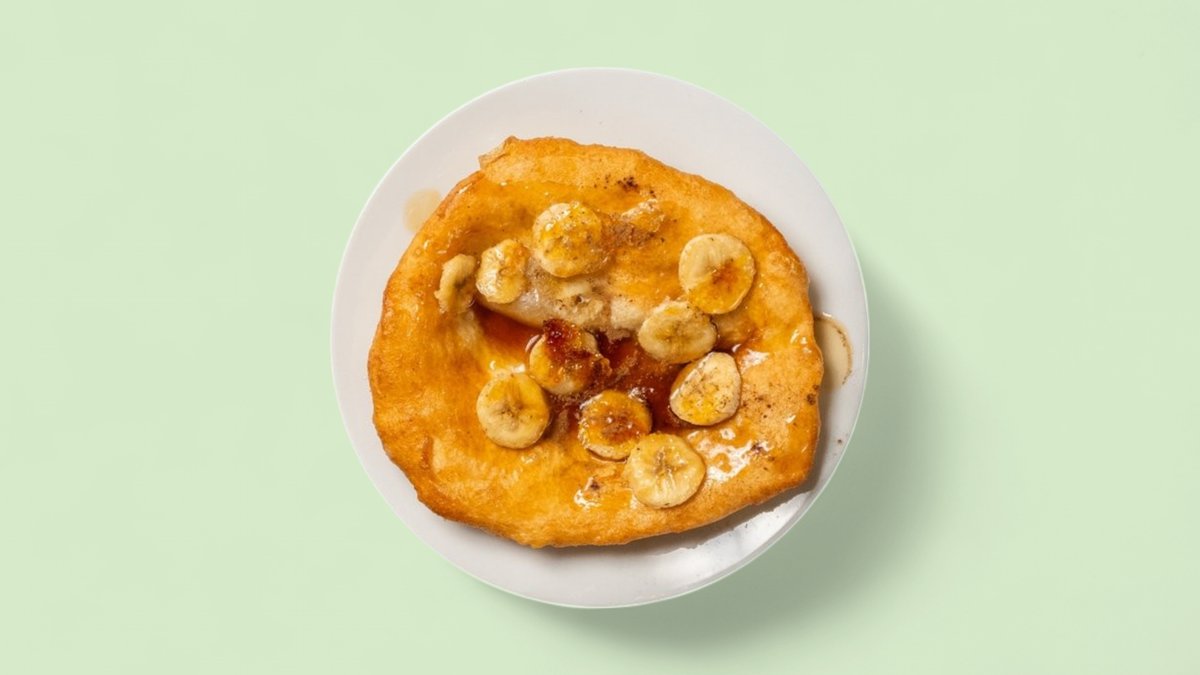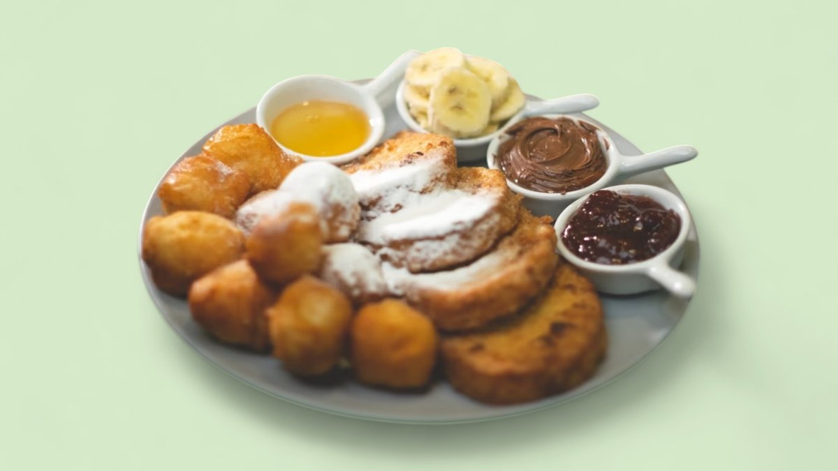 нашата захаросана кутия с 4 пържени филийки и 10 бухтички с пудра захар, към тях има Nutella, мед, сладко от ягоди и нарязан банан