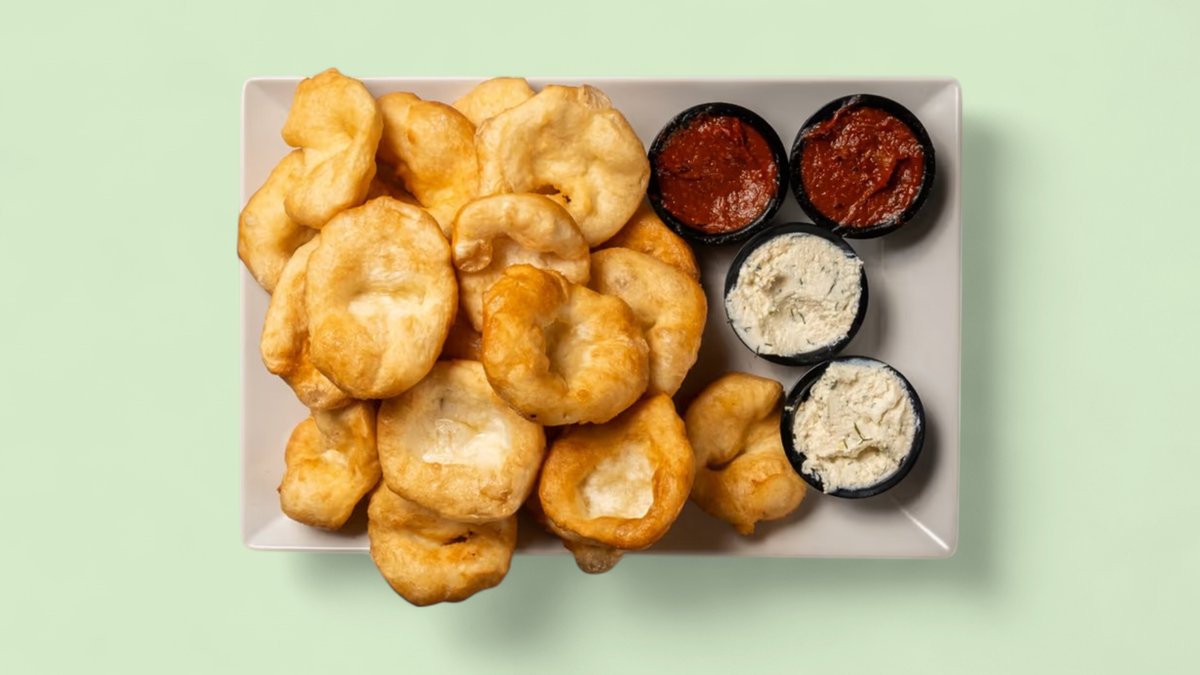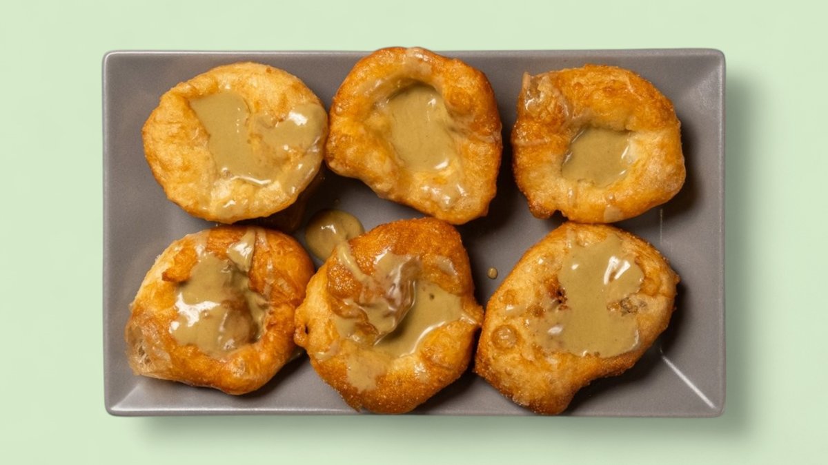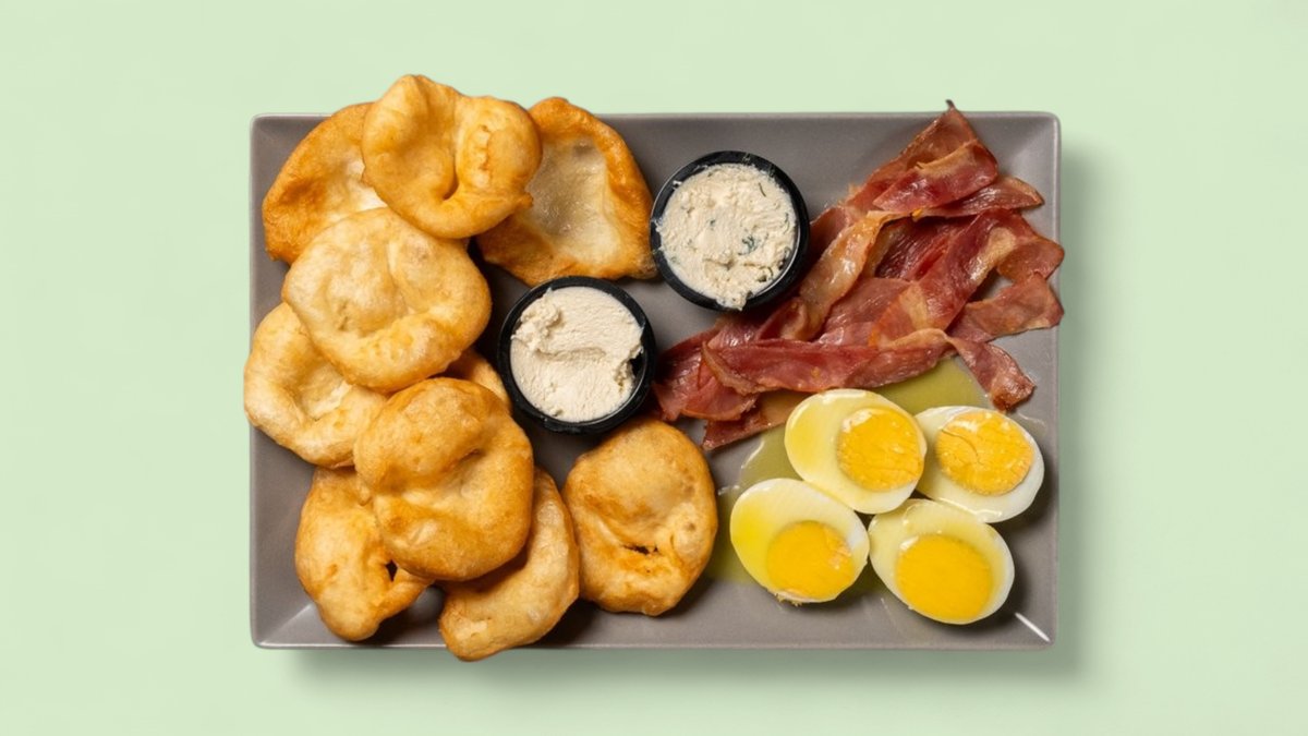 10 мини мекички, 2 варени яйца, заляти със сос Холандез, хрупкаво беконче и две кутийки с крема сирене и родопска смес