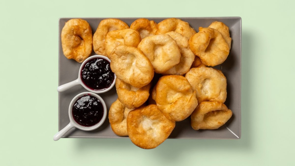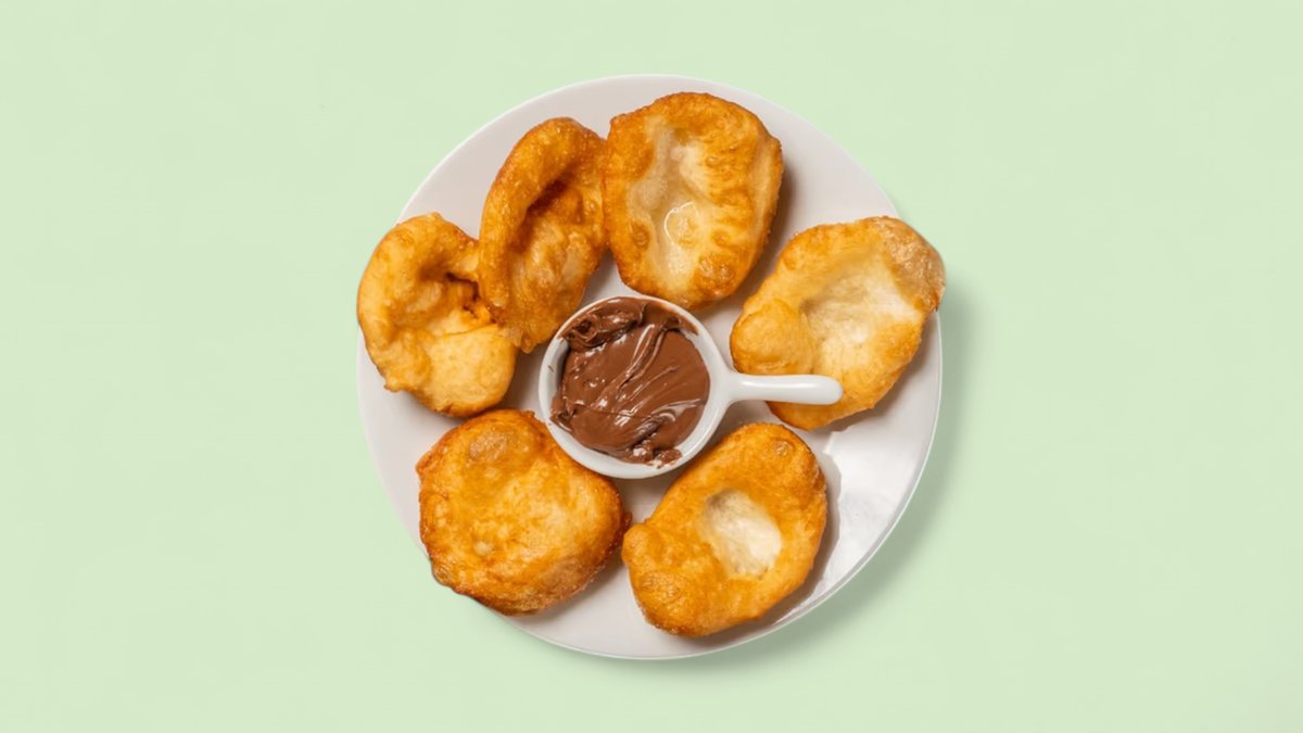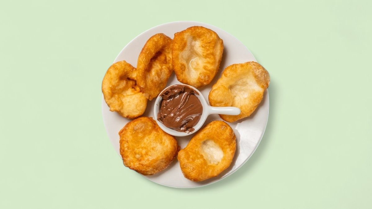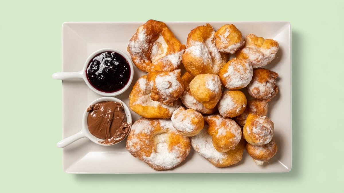 8 мини мекици, 12 бухти с пудра захар, към тях Nutella и сладко от боровинки