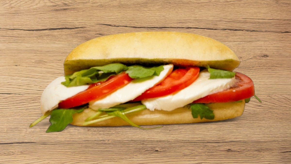 моцарела, песто, домати, рукола. Продуктите в сандвича не могат да бъдат заменени или извадени