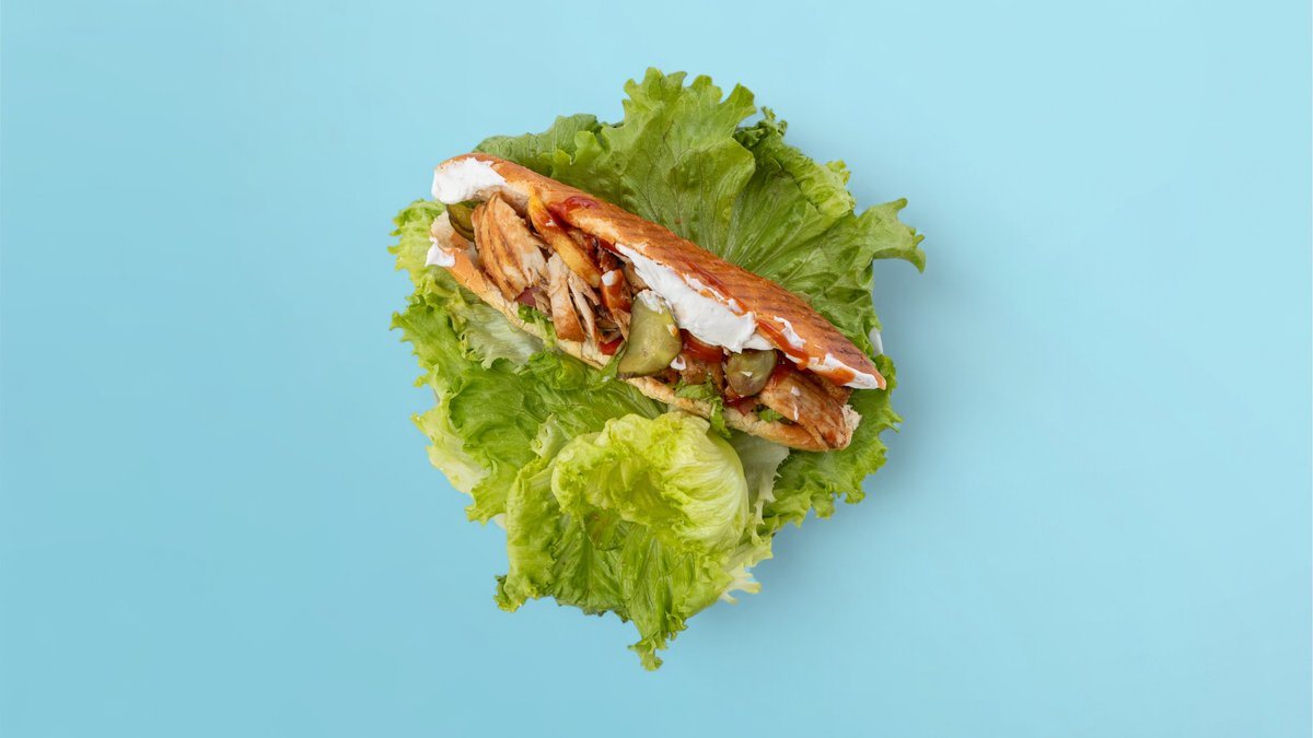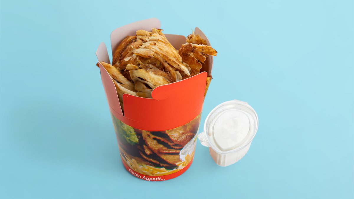 арабска питка, пилешко месо, картофи, домати, кисели краставички, маруля, чеснов сос 500г