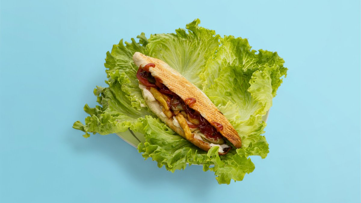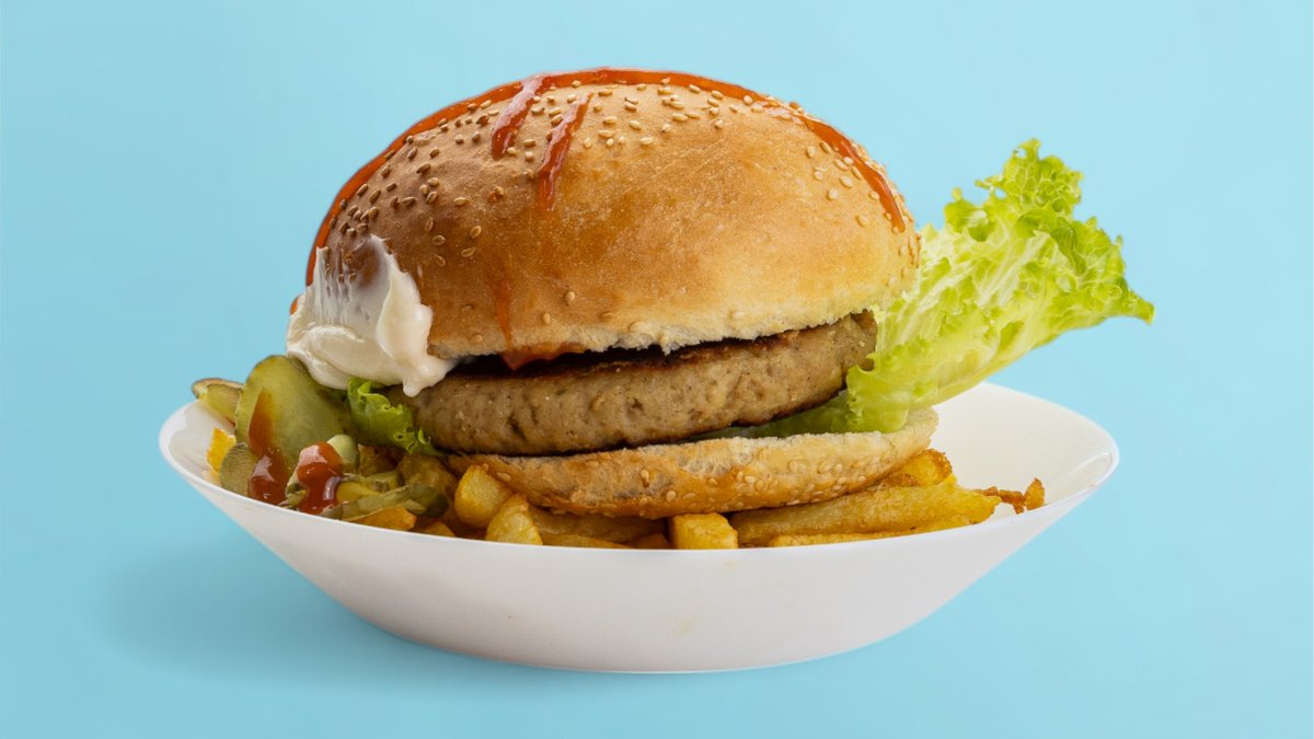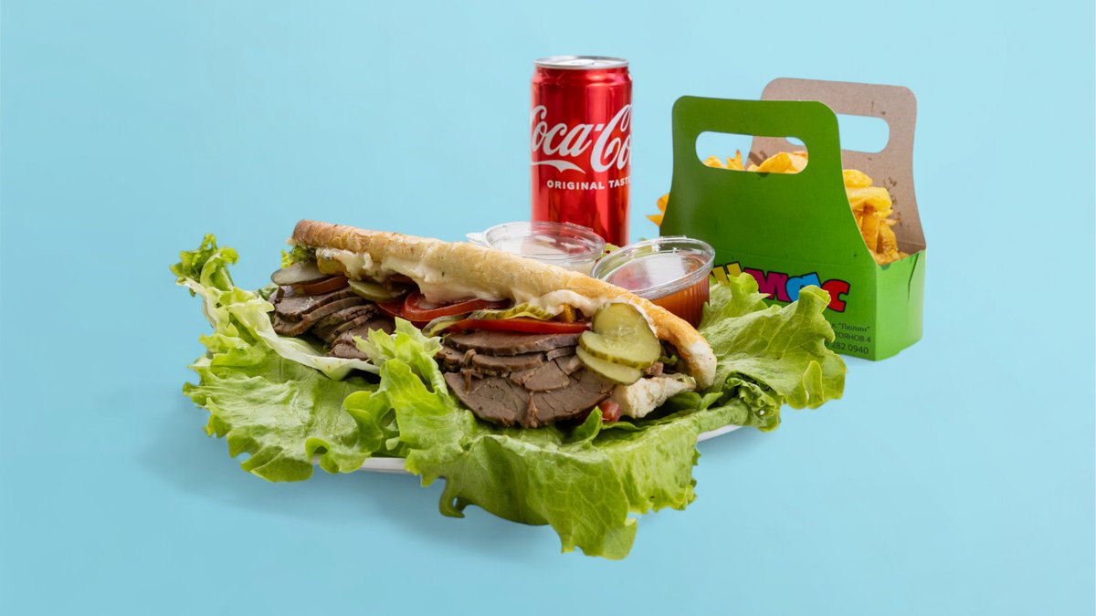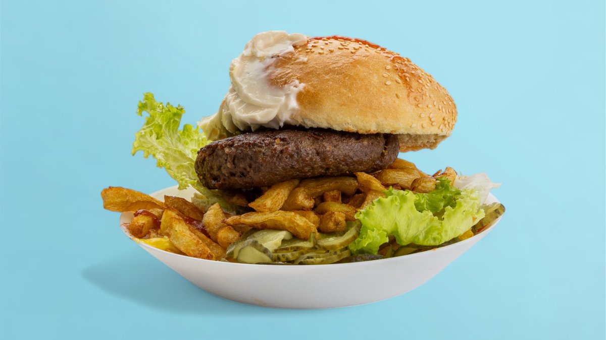 хляб, телешка кайма, картофи, домати, кисели краставички, маруля, кетчуп, майонеза 600г