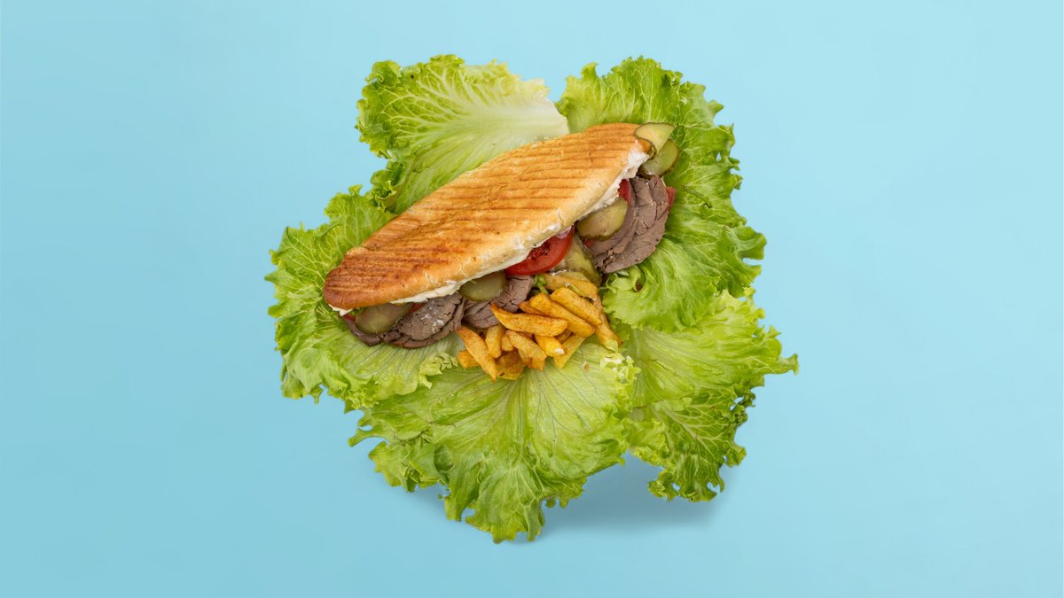 телешко бон филе, картофи, маруля, домати и кисели краставички, кетчуп и майонеза