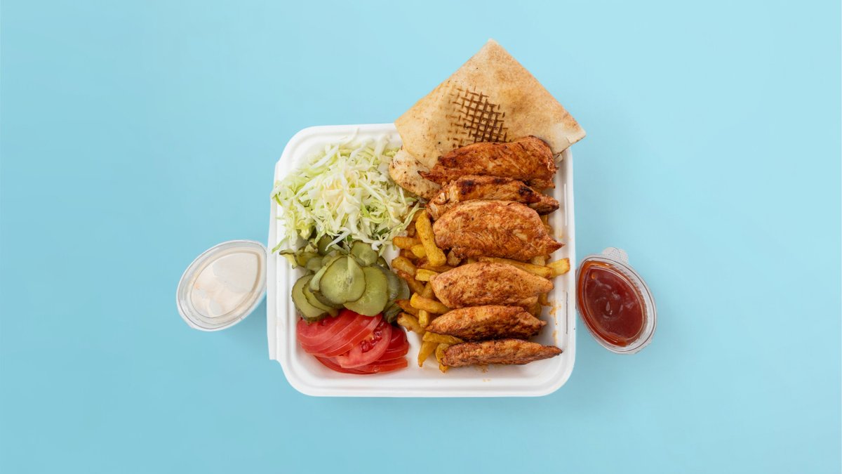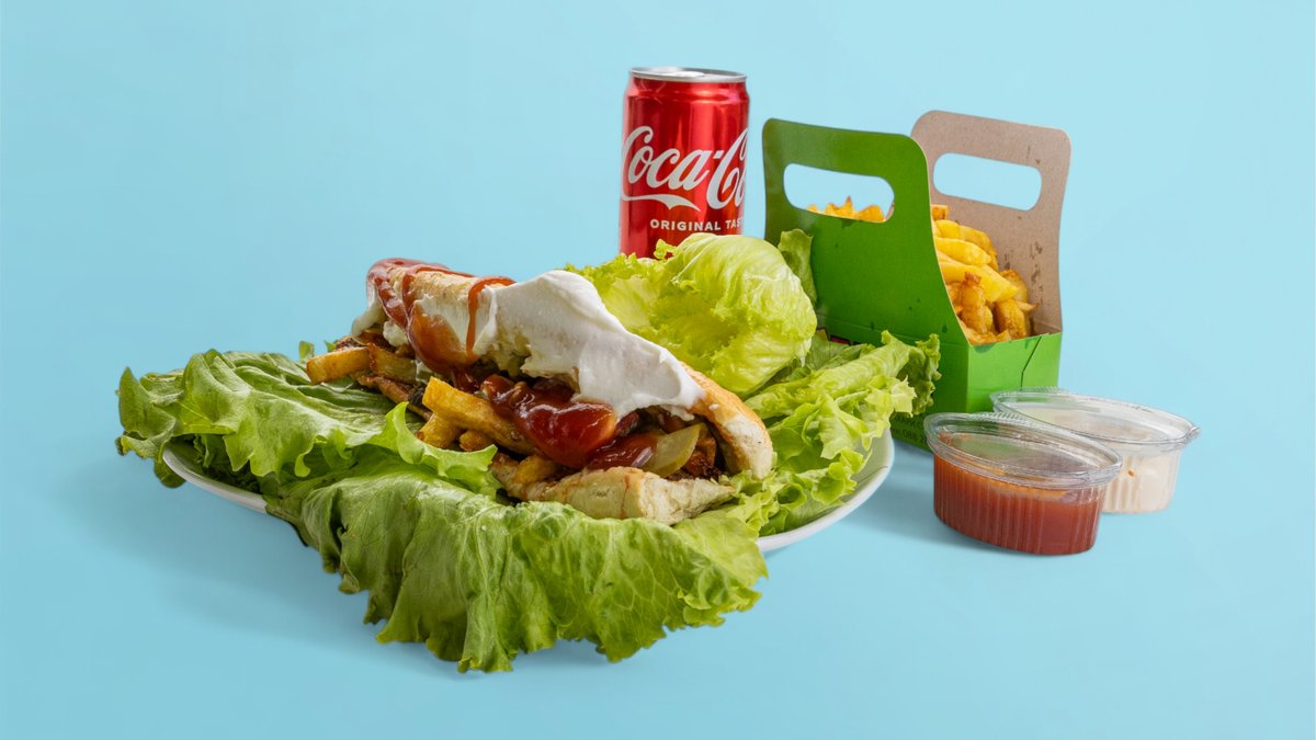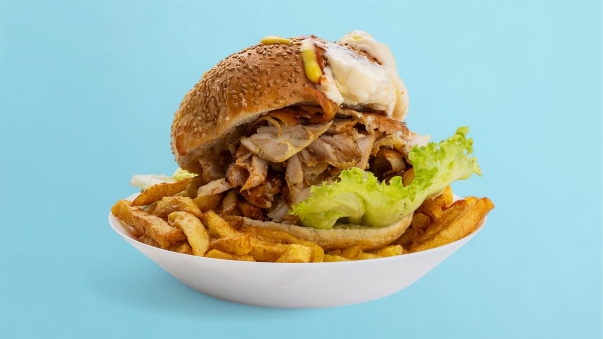 пилешко бон филе, картофи, арабска питка, домати, кисели краставички, маруля, кетчуп, майонеза 700г