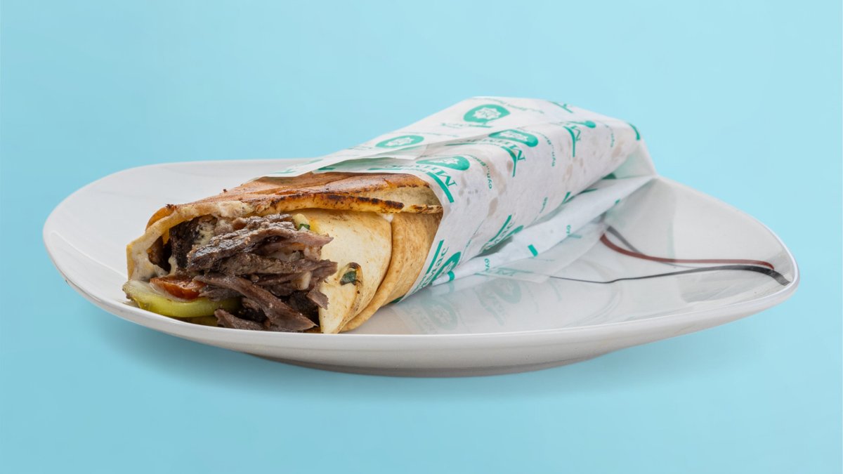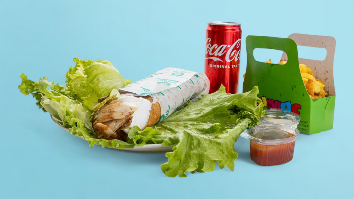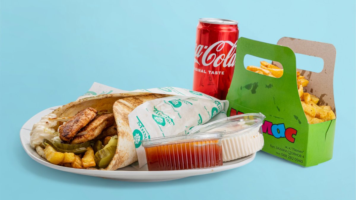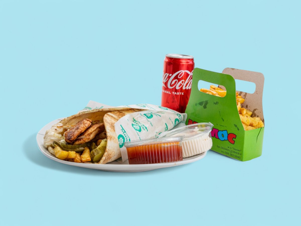 арабска питка, пилешко месо, чеснов сос, домати, маруля, каротфи, кисели краставички, кетчуп, майонеза, айрян 330мл, 500г