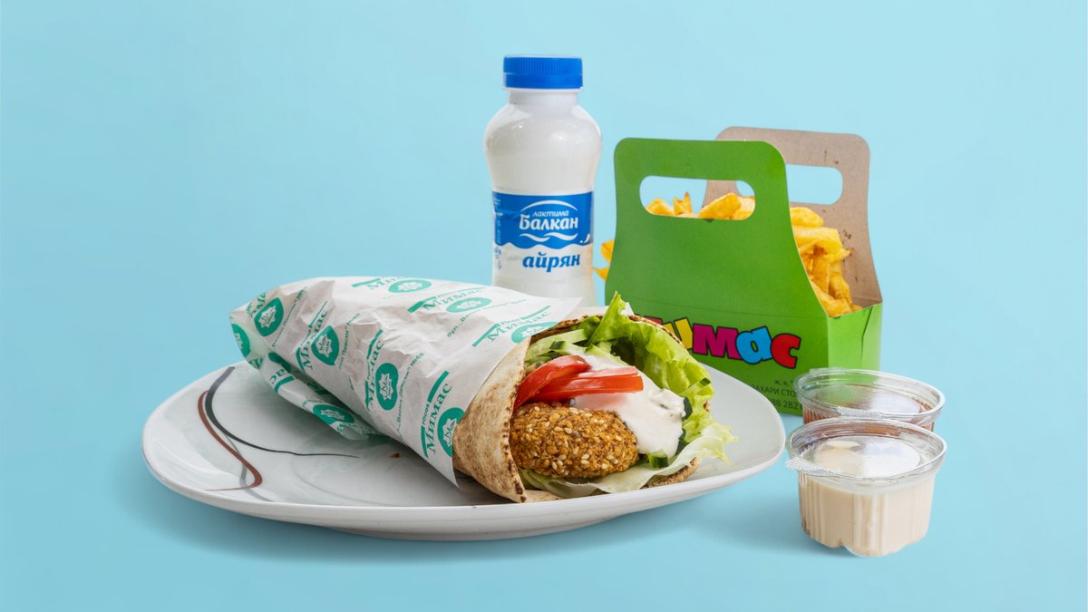 фалафел (кюфте от нахут), млечен сос, маруля, домати, кисели краставички 310г